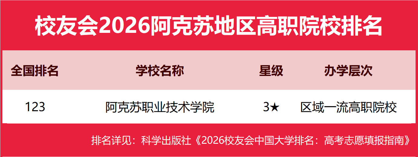 | 校友会2026阿克苏地区大学排名,新疆理工学院、阿克苏职业技术学院第一 | |||
