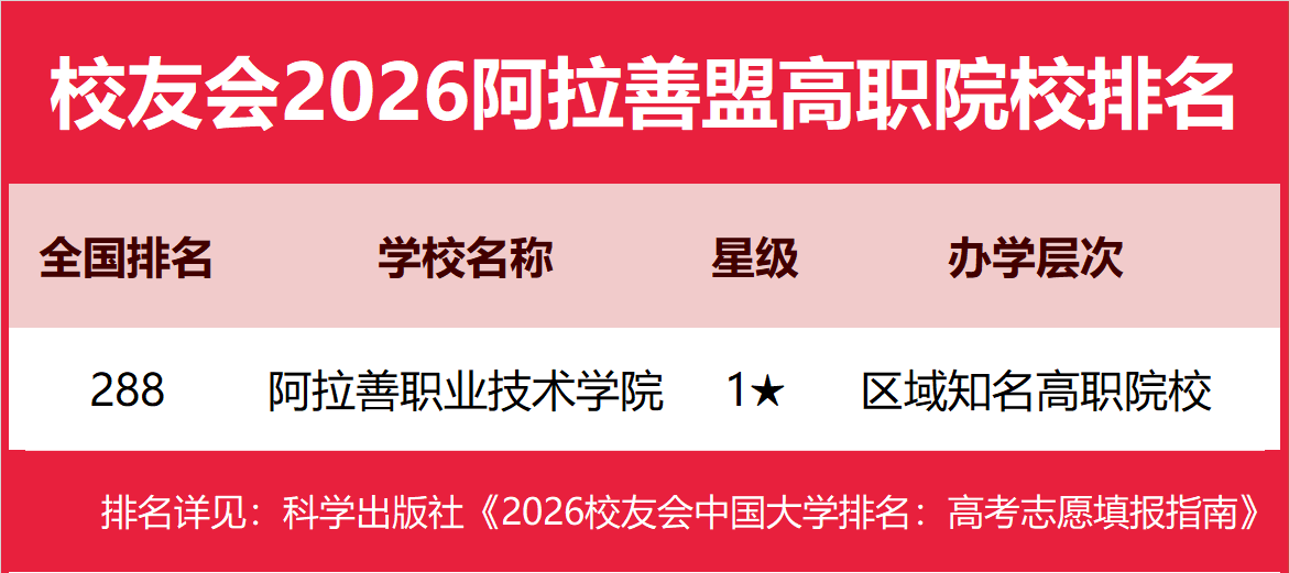 | 校友会2026阿拉善盟大学排名,阿拉善职业技术学院第一 | |||
