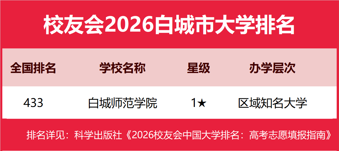 在校友会2026中国大学排名中,白城师范学院全国排名第433名,雄居校友会2026白城市大学排名第一。