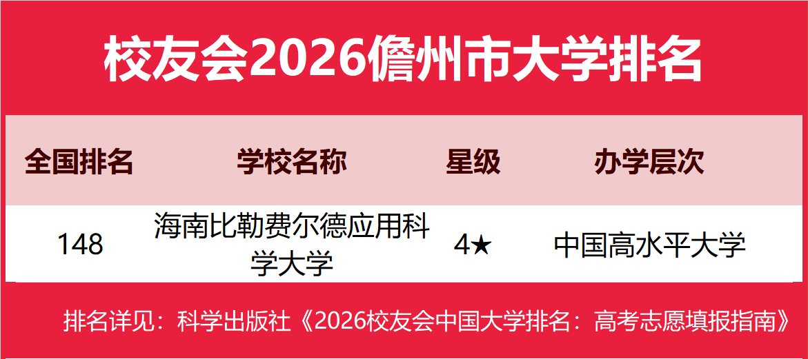 | 校友会2026儋州市大学排名,海南比勒费尔德应用科学大学第一 | |||