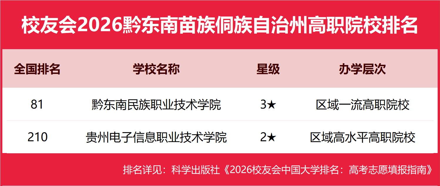 | 校友会2026黔东南苗族侗族自治州大学排名,凯里学院、黔东南民族职业技术学院第一 | |||