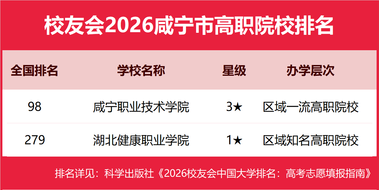 | 校友会2026咸宁市大学排名,湖北科技学院、咸宁职业技术学院第一 | |||