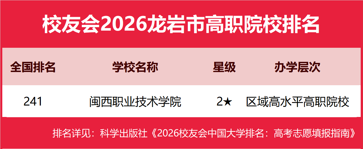 | 校友会2026龙岩市大学排名,龙岩学院、闽西职业技术学院第一 | |||
