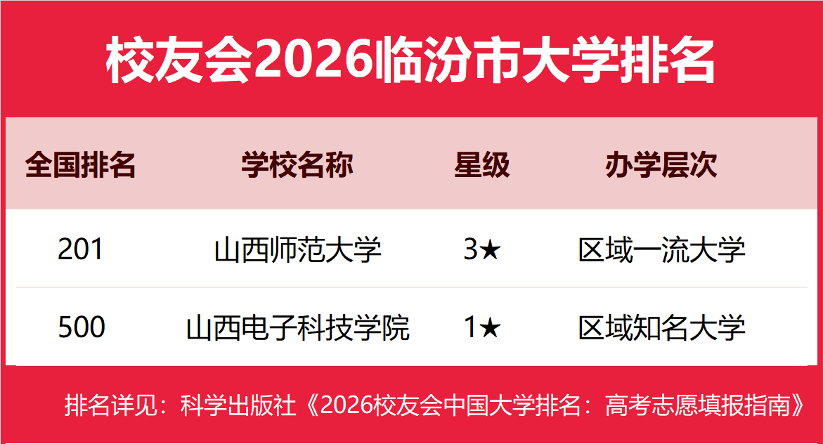在校友会2026中国大学排名中,山西师范大学全国排名第201名,雄居校友会2026临汾市大学排名第一。山西电子科技学院第2。