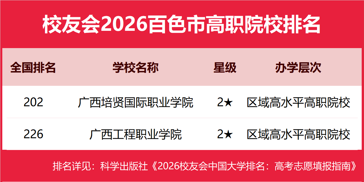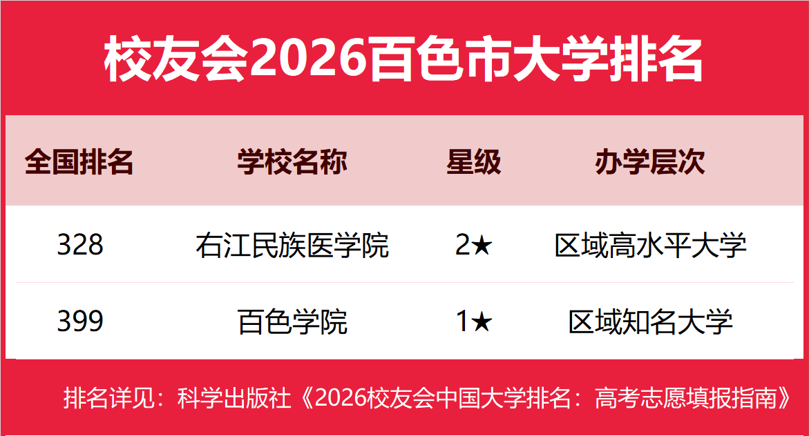 | 校友会2026百色市大学排名,右江民族医学院、广西培贤国际职业学院第一 | |||