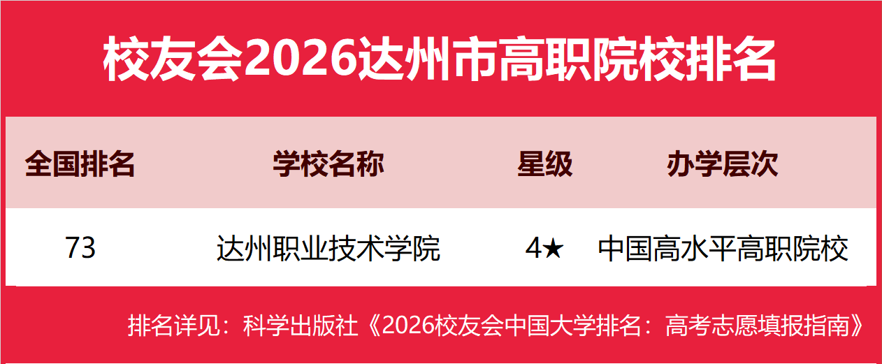 在校友会2026中国高职院校排名中,达州职业技术学院全国排名第73名,雄居校友会2026达州市高职院校排名第一。