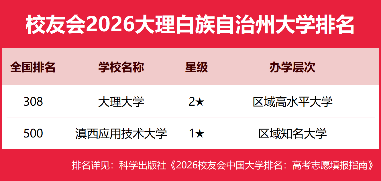 校友会2026大理白族自治州大学排名,大理大学第一,滇西应用技术大学前二