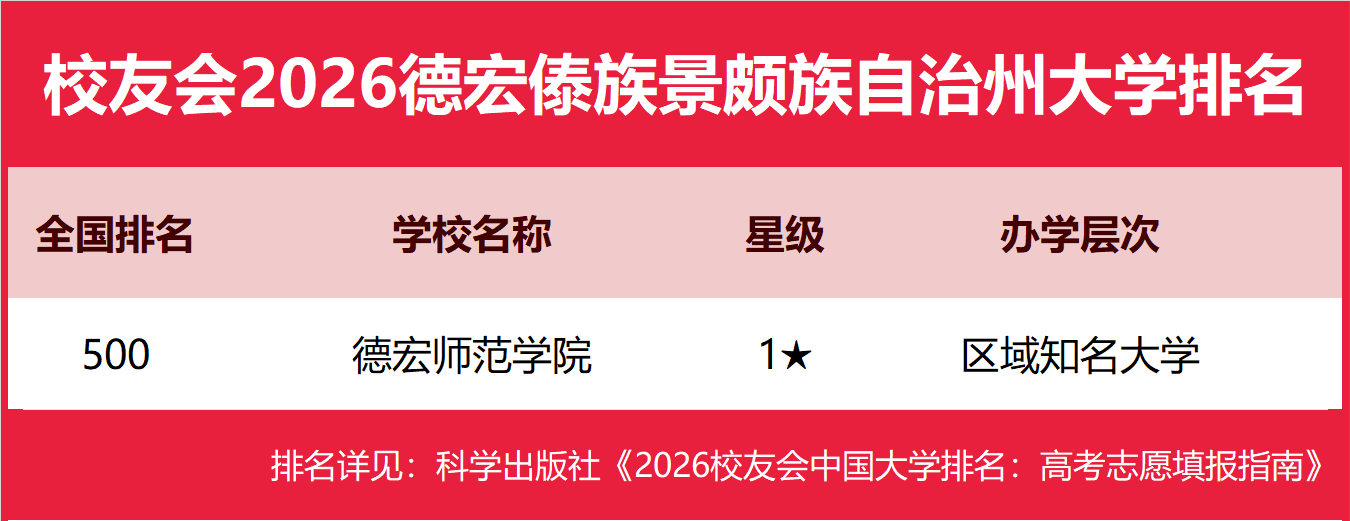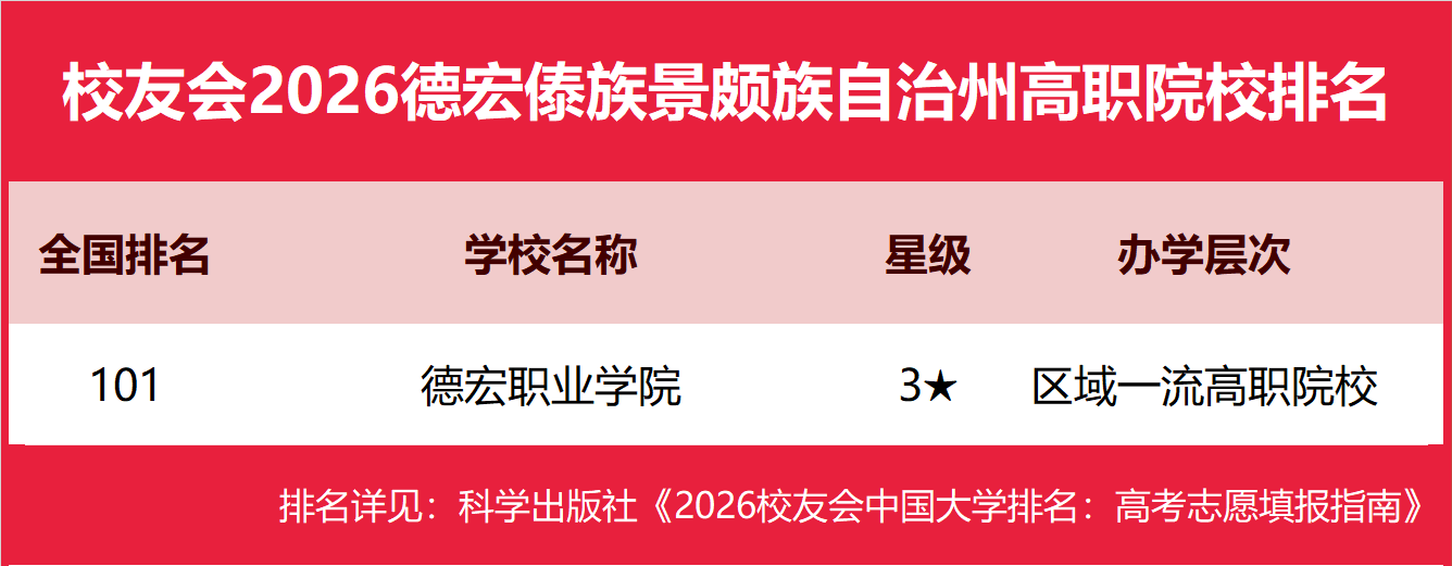 | 校友会2026德宏傣族景颇族自治州大学排名,德宏师范学院、德宏职业学院第一 | |||