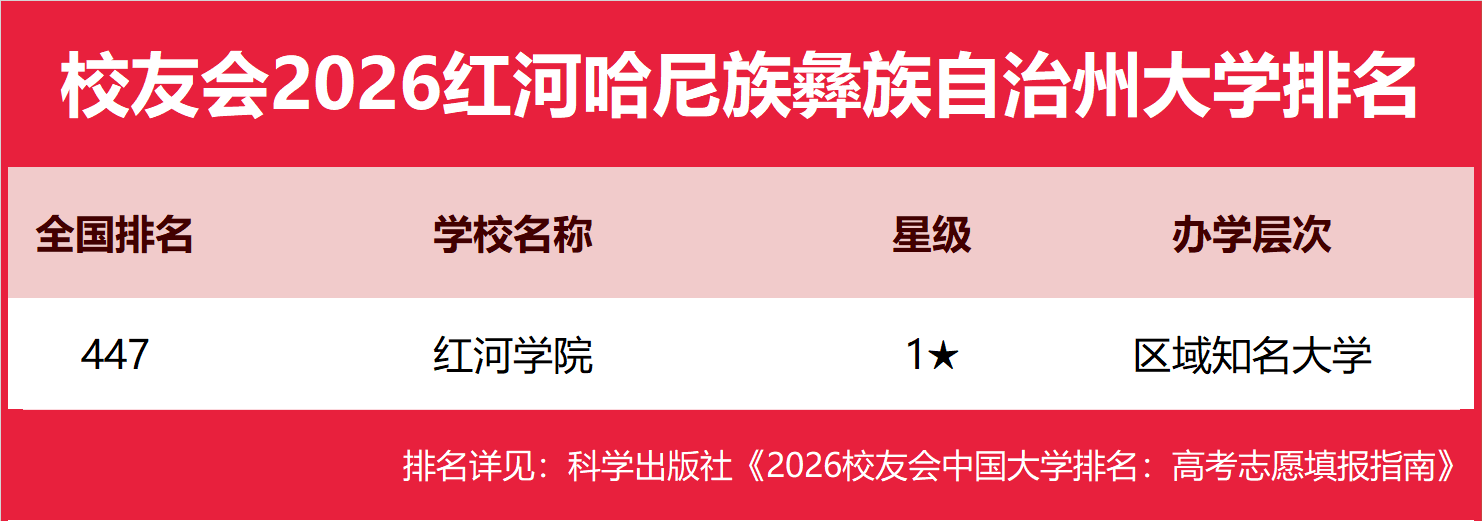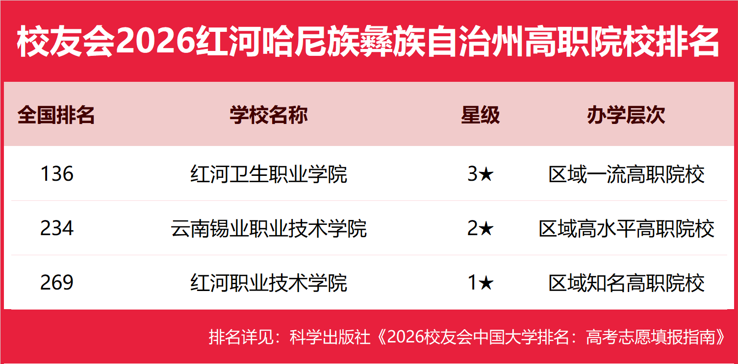 | 校友会2026红河哈尼族彝族自治州大学排名,红河学院、红河卫生职业学院第一 | |||