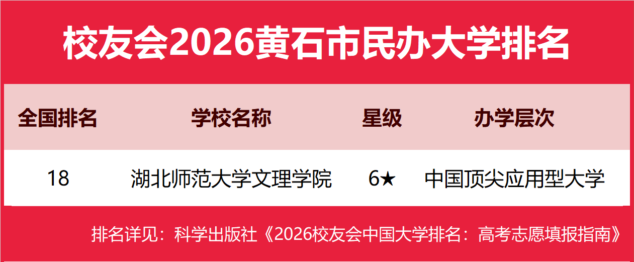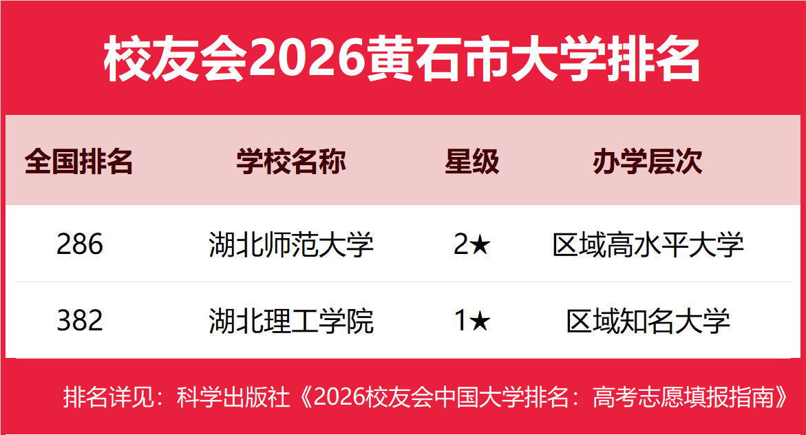 | 校友会2026黄石市大学排名,湖北师范大学、湖北师范大学文理学院、湖北工程职业学院第一 | |||