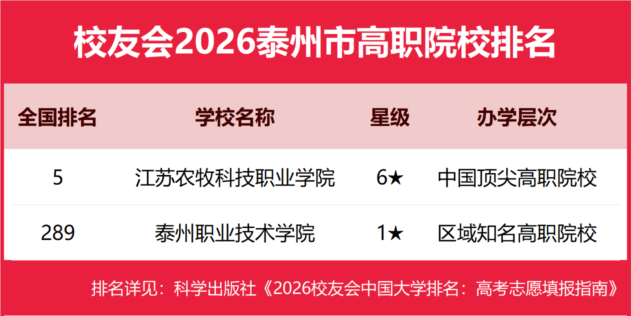 在校友会2026中国高职院校排名中,江苏农牧科技职业学院全国排名第5名,雄居校友会2026泰州市高职院校排名第一。泰州职业技术学院第2。