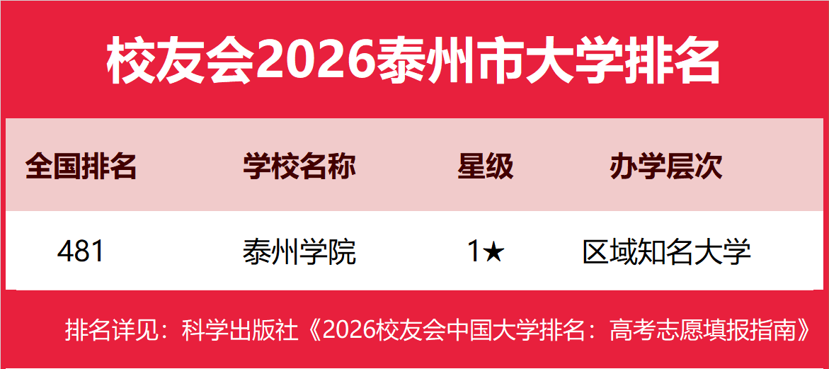 在校友会2026中国大学排名中,泰州学院全国排名第481名,雄居校友会2026泰州市大学排名第一。
