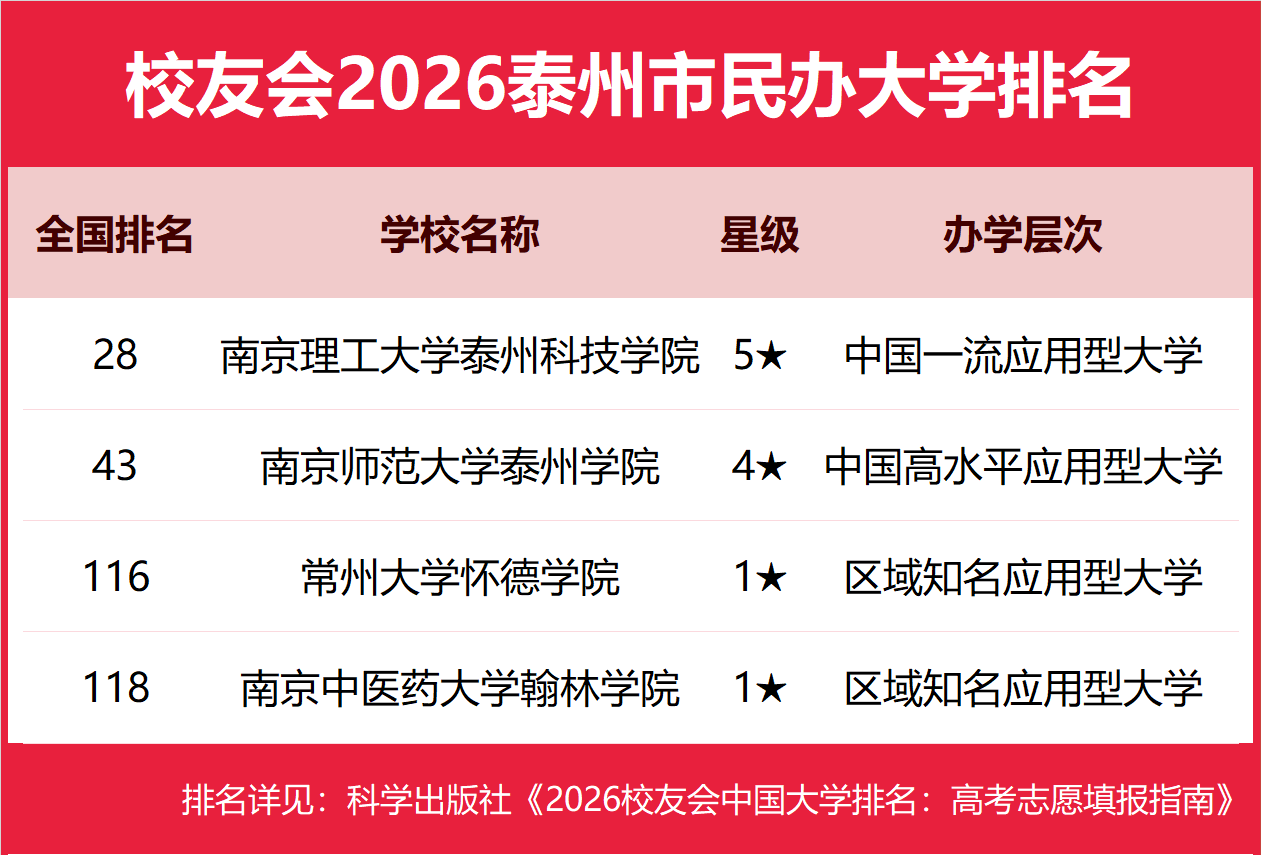 校友会2026泰州市民办大学排名,南京理工大学泰州科技学院第一,南京师范大学泰州学院、常州大学怀德学院前三