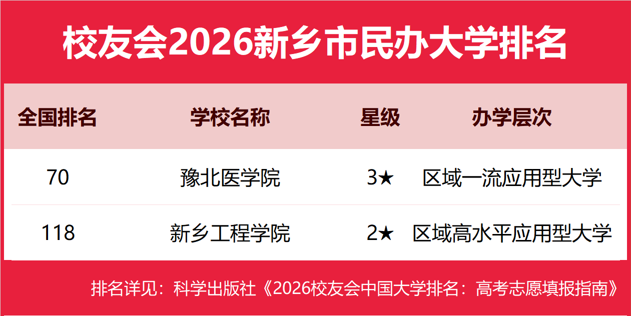 1月12日,全国第三方大学评价机构艾瑞深校友会网(Cuaa.net)正式发布校友会2026中国大学排名、2026新乡市大学排名、2026新乡市民办大学排名和2026新乡市高职院校排名等榜单。 北京大学问鼎校友会2026中国大学排名榜首,连续20年蝉联中国大学排名冠军。清华大学第二,中国科学院大学、浙江大学并列第三,南开大学挺进前七。其中,河南师范大学、新乡工程学院、新乡职业技术学院分列2026新乡市大学、民办大学和高职院校排名第一 由艾瑞深研究团队撰写的《2026校友会中国大学排名:高考志愿填报指南》一书将由科学出版社出版发行。 科学出版社《2026校友会中国大学排名:高考志愿填报指南》 校友会2026新乡市大学排名,河南师范大学第一,河南科技学院、河南医药大学前三 在校友会2026中国大学排名中,河南师范大学全国排名第148名,雄居校友会2026新乡市大学排名第一。河南科技学院第2,河南医药大学第3。名列前10名的其他院校为新乡学院、河南工学院。 校友会2026新乡市民办大学排名,豫北医学院第一,新乡工程学院前三 在校友会2026中国民办大学排名中,豫北医学院全国排名第70名,雄居校友会2026新乡市民办大学排名第一。新乡工程学院第2。 校友会2026新乡市高职院校排名,新乡职业技术学院第一,河南女子职业学院前三 在校友会2026中国高职院校排名中,新乡职业技术学院全国排名第99名,雄居校友会2026新乡市高职院校排名第一。河南女子职业学院第2。 校友会中国大学排名首发于2003年,至今已有24年的历史,已成为具有广泛社会影响力、公信力、参考价值与创新力的中国大学排名领先品牌。 艾瑞深校友会2026中国大学排名评价指标体系由办学层次、思政教育、教学质量、高层次人才、杰出校友、学科专业、科研基地、科研项目、科研成果、社会服务、社会声誉和国际影响力等12大一级指标组成。 |