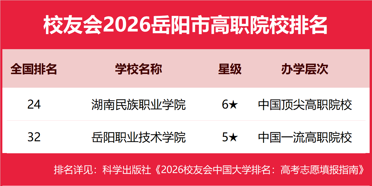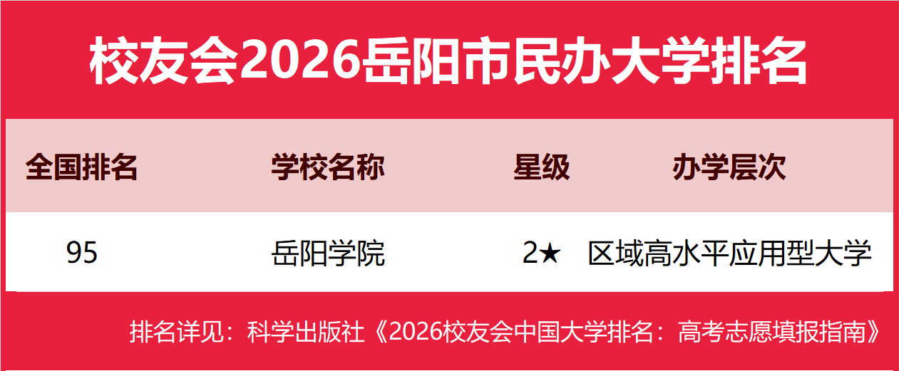| 校友会2026岳阳市大学排名,湖南理工大学、岳阳学院、湖南民族职业学院第一 | |||