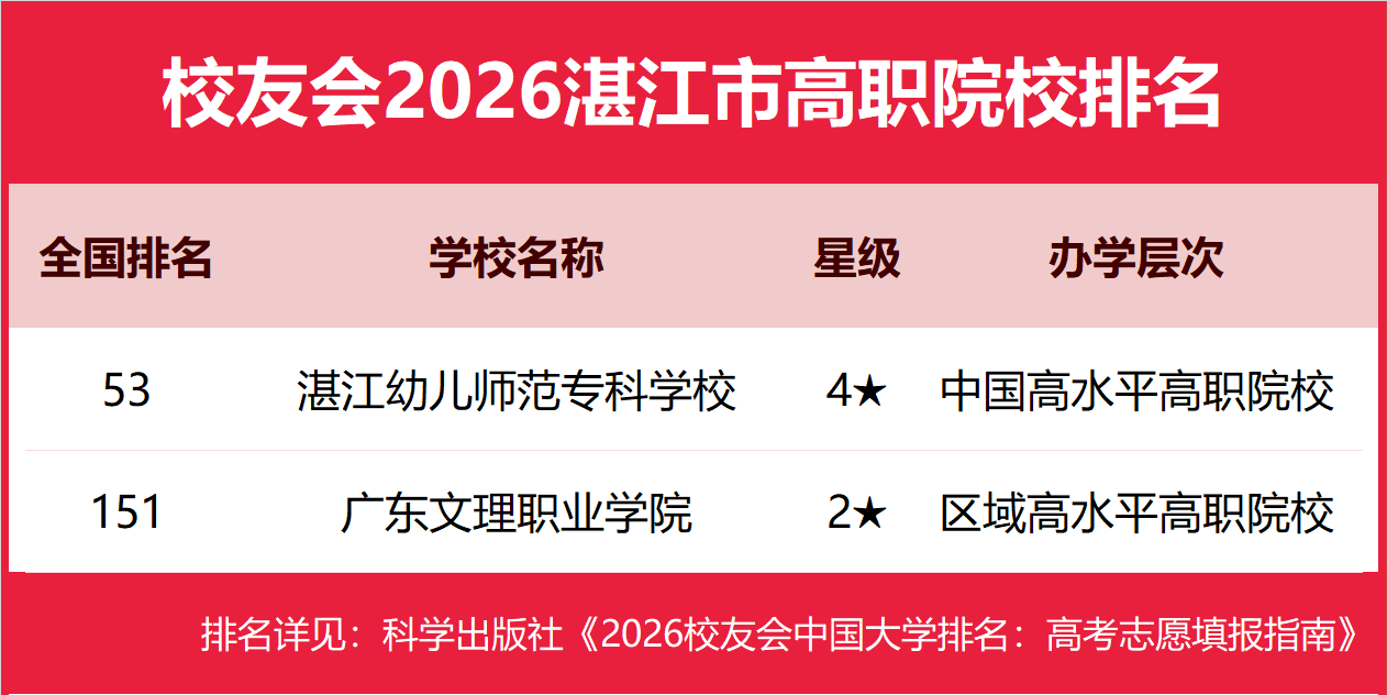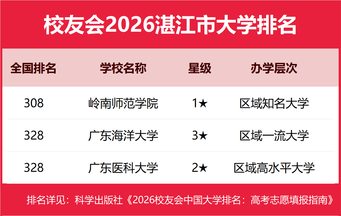 | 校友会2026湛江市大学排名,岭南师范学院、湛江科技学院、湛江幼儿师范专科学校第一 | |||