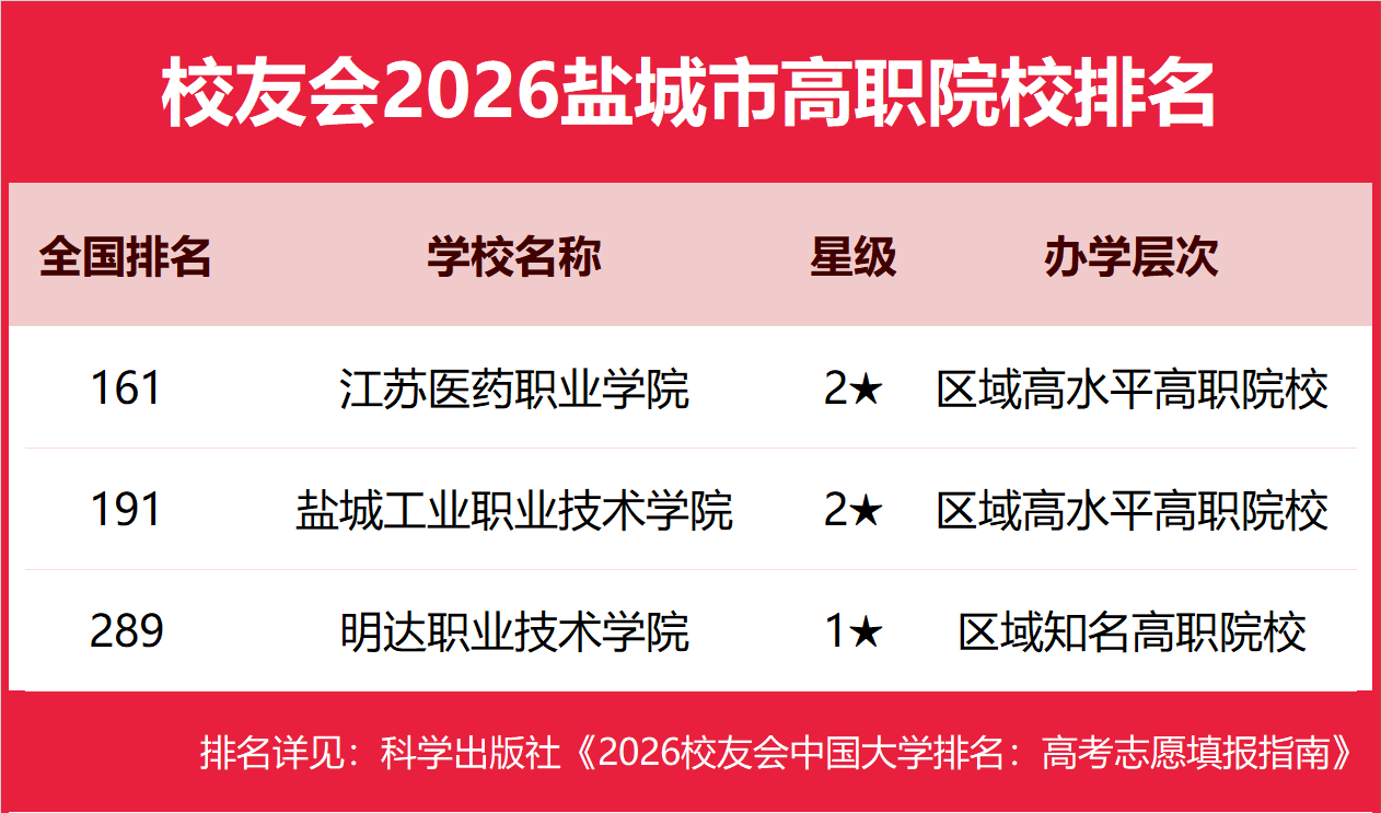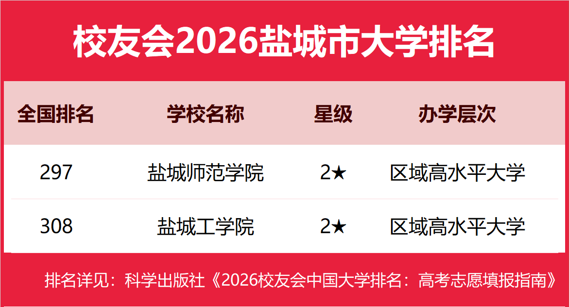 1月12日,全国第三方大学评价机构艾瑞深校友会网(Cuaa.net)正式发布校友会2026中国大学排名、2026盐城市大学排名和2026盐城市高职院校排名等榜单。 北京大学问鼎校友会2026中国大学排名榜首,连续20年蝉联中国大学排名冠军。清华大学第二,中国科学院大学、浙江大学并列第三,南开大学挺进前七。其中,盐城师范学院、江苏医药职业学院分列2026盐城市大学和高职院校排名第一 由艾瑞深研究团队撰写的《2026校友会中国大学排名:高考志愿填报指南》一书将由科学出版社出版发行。 科学出版社《2026校友会中国大学排名:高考志愿填报指南》 校友会2026盐城市大学排名,盐城师范学院第一,盐城工学院前三 在校友会2026中国大学排名中,盐城师范学院全国排名第297名,雄居校友会2026盐城市大学排名第一。盐城工学院第2。 校友会2026盐城市高职院校排名,江苏医药职业学院第一,盐城工业职业技术学院、明达职业技术学院前三 在校友会2026中国高职院校排名中,江苏医药职业学院全国排名第161名,雄居校友会2026盐城市高职院校排名第一。盐城工业职业技术学院第2,明达职业技术学院第3。 校友会中国大学排名首发于2003年,至今已有24年的历史,已成为具有广泛社会影响力、公信力、参考价值与创新力的中国大学排名领先品牌。 艾瑞深校友会2026中国大学排名评价指标体系由办学层次、思政教育、教学质量、高层次人才、杰出校友、学科专业、科研基地、科研项目、科研成果、社会服务、社会声誉和国际影响力等12大一级指标组成。 |
