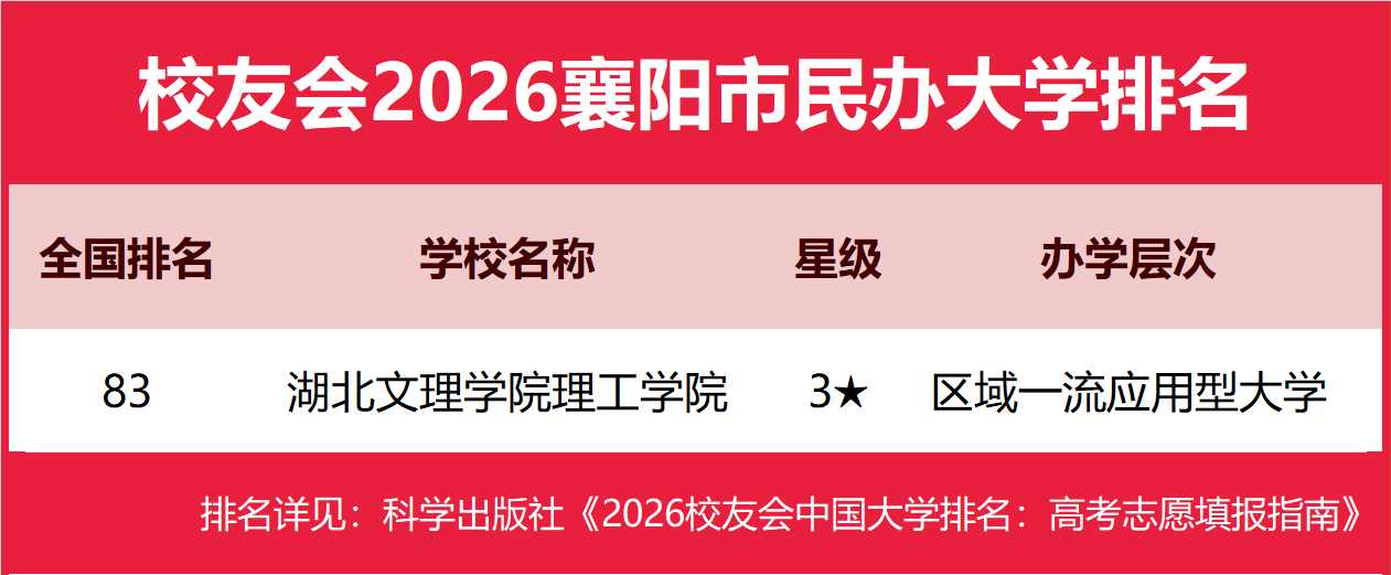 | 校友会2026襄阳市大学排名,湖北文理学院、湖北文理学院理工学院、襄阳职业技术学院第一 | |||