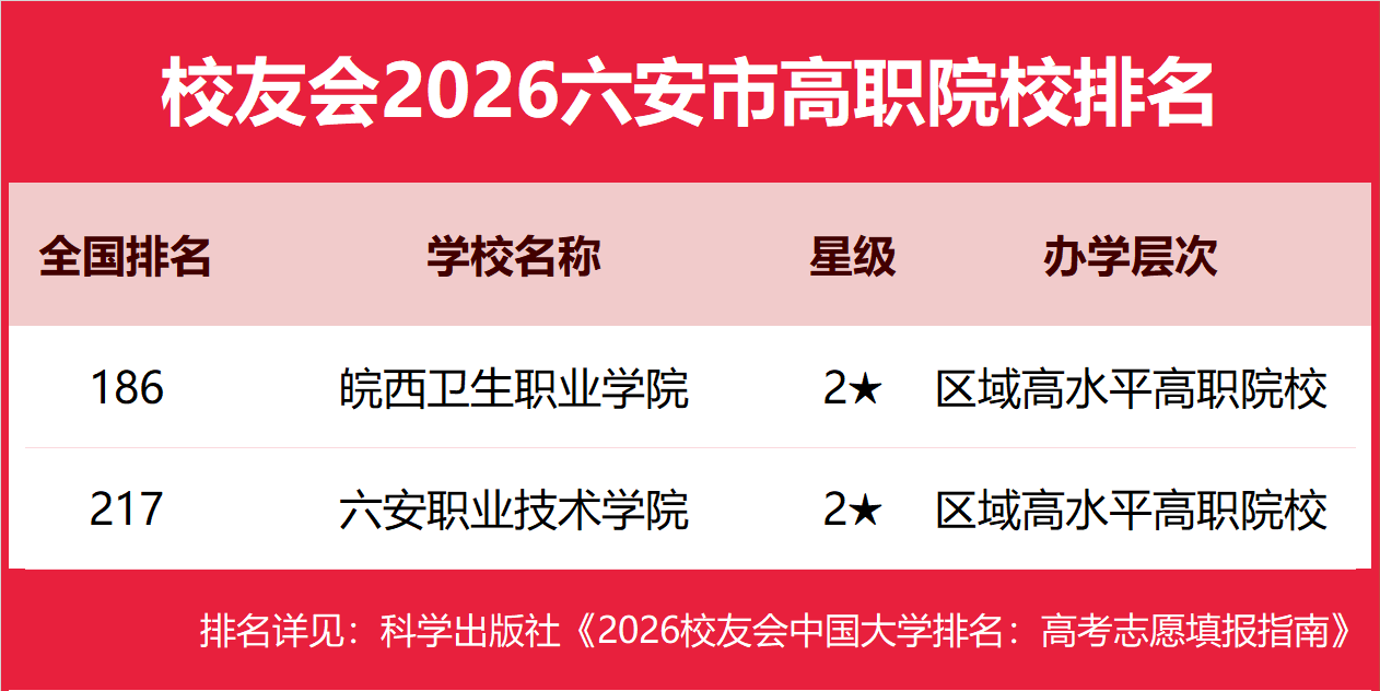 在校友会2026中国高职院校排名中,皖西卫生职业学院全国排名第186名,雄居校友会2026六安市高职院校排名第一。六安职业技术学院第2。