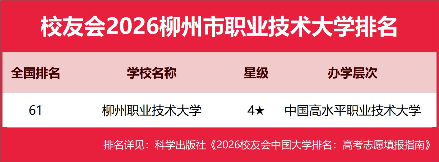 | 校友会2026柳州市大学排名,广西科技大学、柳州工学院、柳州职业技术大学、广西生态工程职业技术学院第一 | |||