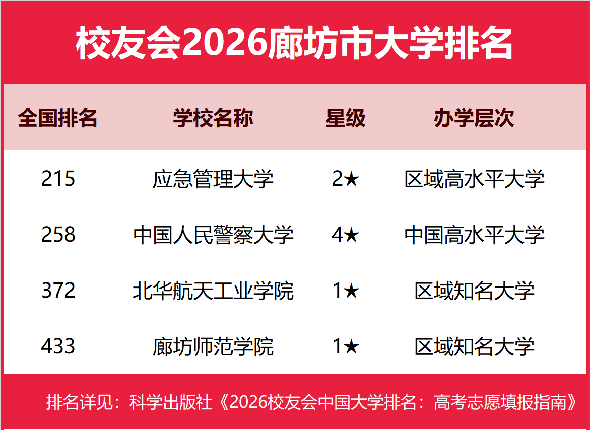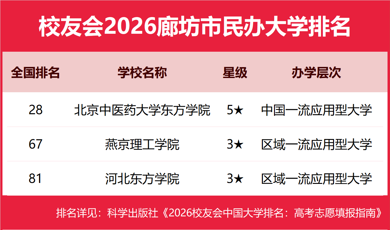 | 校友会2026廊坊市大学排名,应急管理大学、北京中医药大学东方学院、廊坊职业技术学院第一 | |||
