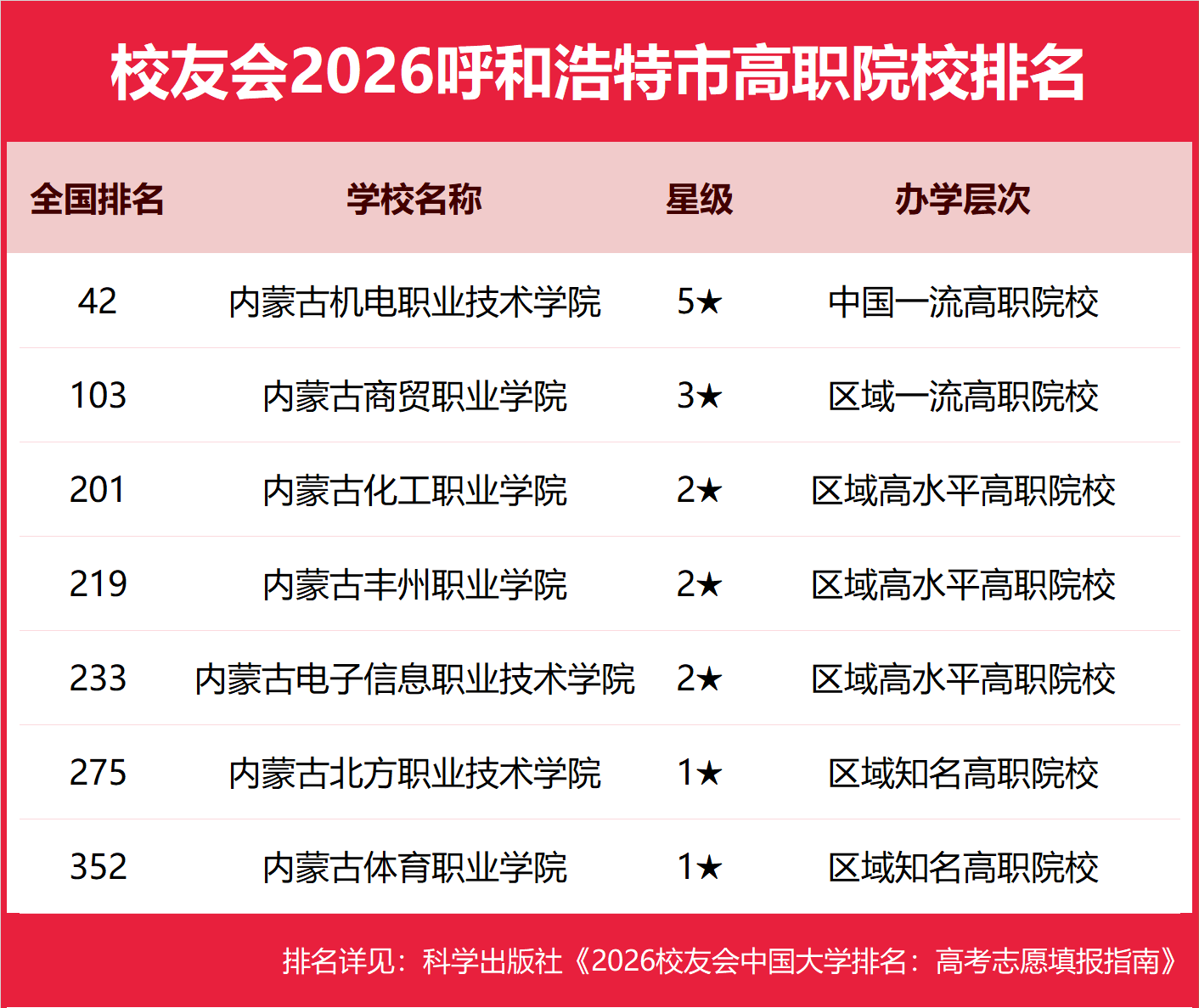 1月12日,全国第三方大学评价机构艾瑞深校友会网(Cuaa.net)正式发布校友会2026中国大学排名、2026呼和浩特市大学排名、2026呼和浩特市民办大学排名、2026呼和浩特市职业技术大学排名和2026呼和浩特市高职院校排名等榜单。 北京大学问鼎校友会2026中国大学排名榜首,连续20年蝉联中国大学排名冠军。清华大学第二,中国科学院大学、浙江大学并列第三,南开大学挺进前七。其中,内蒙古大学、呼和浩特职业技术大学、内蒙古机电职业技术学院分列2026呼和浩特市大学、民办大学、职业技术大学和高职院校排名第一 由艾瑞深研究团队撰写的《2026校友会中国大学排名:高考志愿填报指南》一书将由科学出版社出版发行。 科学出版社《2026校友会中国大学排名:高考志愿填报指南》 校友会2026呼和浩特市大学排名,内蒙古大学第一,内蒙古工业大学、内蒙古农业大学前三 在校友会2026中国大学排名中,内蒙古大学全国排名第92名,雄居校友会2026呼和浩特市大学排名第一。内蒙古工业大学第2,内蒙古农业大学第3。名列前10名的其他院校为内蒙古师范大学、内蒙古医科大学、内蒙古财经大学、呼和浩特民族学院、内蒙古艺术学院、内蒙古警察学院。 校友会2026呼和浩特市民办大学排名,内蒙古大学创业学院、内蒙古鸿德文理学院并列第一 在校友会2026中国民办大学排名中,内蒙古大学创业学院、内蒙古鸿德文理学院全国排名第98名,雄居校友会2026呼和浩特市民办大学排名并列第一。 校友会2026呼和浩特市职业技术大学排名,呼和浩特职业技术大学第一,内蒙古建筑职业技术大学前三 在校友会2026中国职业技术大学排名中,呼和浩特职业技术大学全国排名第74名,雄居校友会2026呼和浩特市职业技术大学排名第一。内蒙古建筑职业技术大学第2。 校友会2026呼和浩特市高职院校排名,内蒙古机电职业技术学院第一,内蒙古商贸职业学院、内蒙古化工职业学院前三 在校友会2026中国高职院校排名中,内蒙古机电职业技术学院全国排名第42名,雄居校友会2026呼和浩特市高职院校排名第一。内蒙古商贸职业学院第2,内蒙古化工职业学院第3。名列前10名的其他高职院校为内蒙古丰州职业学院、内蒙古电子信息职业技术学院、内蒙古北方职业技术学院、内蒙古体育职业学院。 校友会中国大学排名首发于2003年,至今已有24年的历史,已成为具有广泛社会影响力、公信力、参考价值与创新力的中国大学排名领先品牌。 艾瑞深校友会2026中国大学排名评价指标体系由办学层次、思政教育、教学质量、高层次人才、杰出校友、学科专业、科研基地、科研项目、科研成果、社会服务、社会声誉和国际影响力等12大一级指标组成。 |