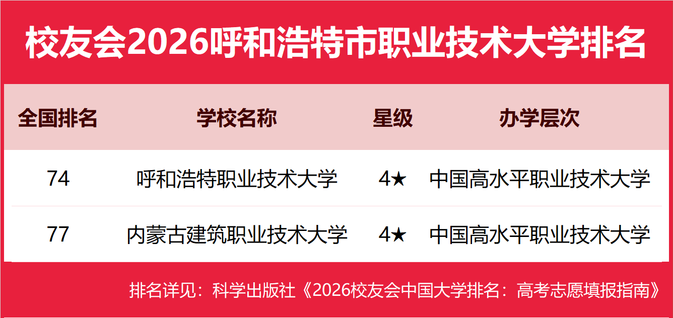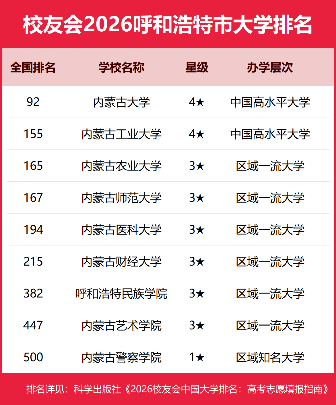 | 校友会2026呼和浩特市大学排名,内蒙古大学、内蒙古大学创业学院、内蒙古鸿德文理学院、呼和浩特职业技术大学、内蒙古机电职业技术学院第一 | |||