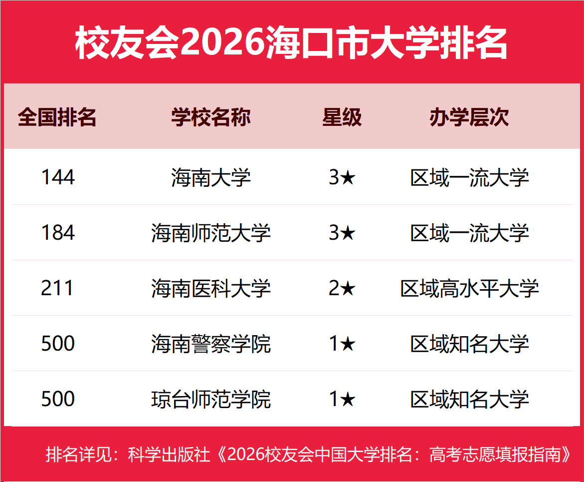 | 校友会2026海口市大学排名,海南大学、海口经济学院、海南科技职业大学、海南经贸职业技术学院第一 | |||