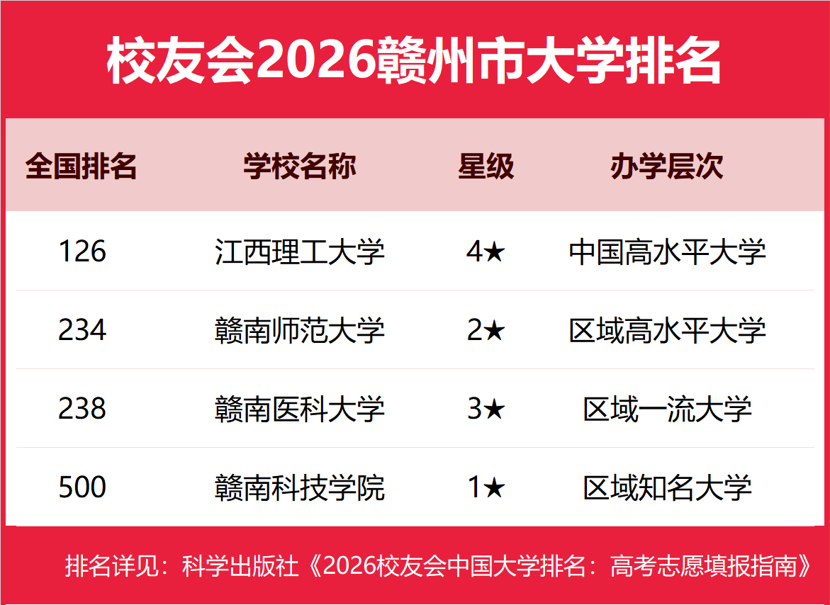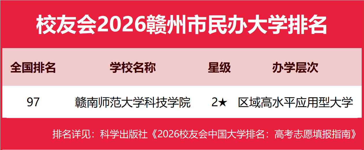 | 校友会2026赣州市大学排名,江西理工大学、赣南师范大学科技学院、江西应用技术职业学院第一 | |||