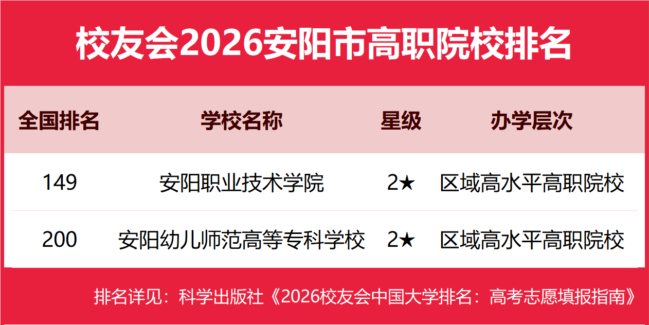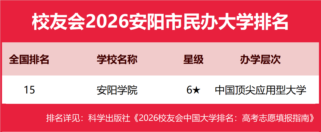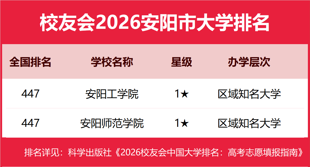 1月12日,全国第三方大学评价机构艾瑞深校友会网(Cuaa.net)正式发布校友会2026中国大学排名、2026安阳市大学排名、2026安阳市民办大学排名和2026安阳市高职院校排名等榜单。 北京大学问鼎校友会2026中国大学排名榜首,连续20年蝉联中国大学排名冠军。清华大学第二,中国科学院大学、浙江大学并列第三,南开大学挺进前七。其中,安阳工学院、安阳师范学院、安阳学院、安阳职业技术学院分列2026安阳市大学、民办大学和高职院校排名第一 由艾瑞深研究团队撰写的《2026校友会中国大学排名:高考志愿填报指南》一书将由科学出版社出版发行。 科学出版社《2026校友会中国大学排名:高考志愿填报指南》 校友会2026安阳市大学排名,安阳工学院、安阳师范学院并列第一 在校友会2026中国大学排名中,安阳工学院、安阳师范学院全国排名第447名,雄居校友会2026安阳市大学排名并列第一。 校友会2026安阳市民办大学排名,安阳学院第一 在校友会2026中国民办大学排名中,安阳学院全国排名第15名,雄居校友会2026安阳市民办大学排名第一。 校友会2026安阳市高职院校排名,安阳职业技术学院第一,安阳幼儿师范高等专科学校前三 在校友会2026中国高职院校排名中,安阳职业技术学院全国排名第149名,雄居校友会2026安阳市高职院校排名第一。安阳幼儿师范高等专科学校第2。 校友会中国大学排名首发于2003年,至今已有24年的历史,已成为具有广泛社会影响力、公信力、参考价值与创新力的中国大学排名领先品牌。 艾瑞深校友会2026中国大学排名评价指标体系由办学层次、思政教育、教学质量、高层次人才、杰出校友、学科专业、科研基地、科研项目、科研成果、社会服务、社会声誉和国际影响力等12大一级指标组成。 |