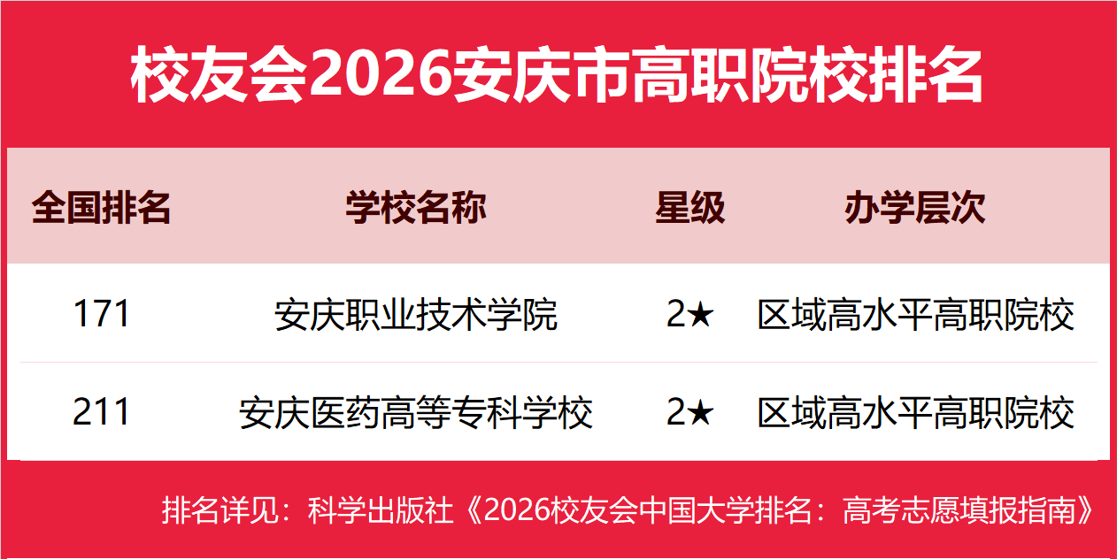 | 校友会2026安庆市大学排名,安庆师范大学、安庆职业技术学院第一 | |||