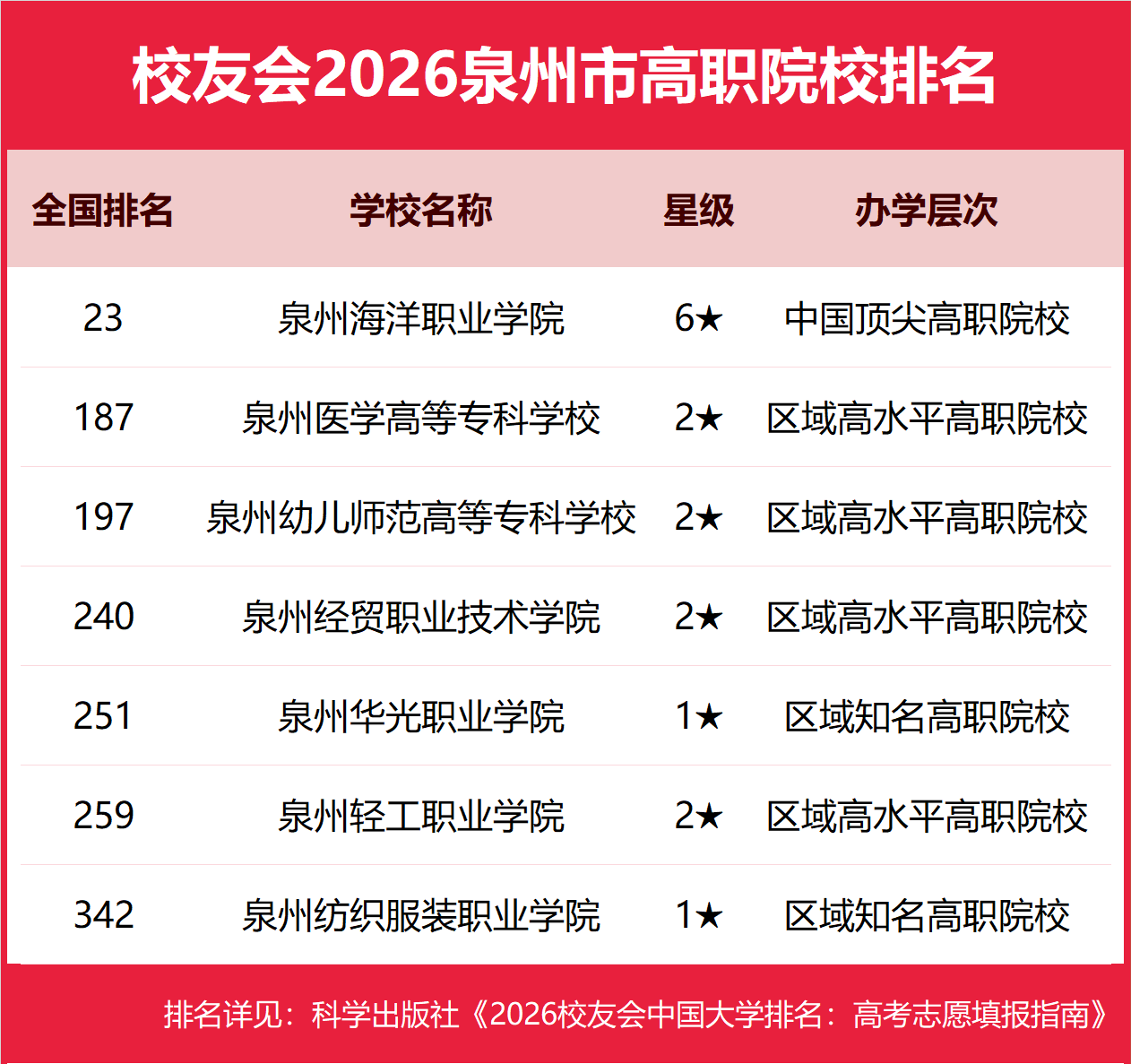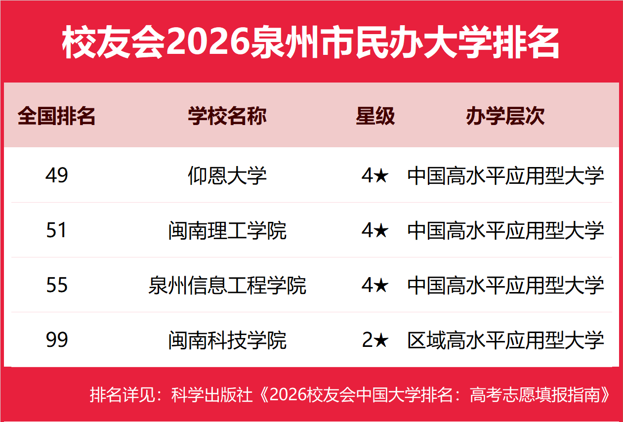 1月12日,全国第三方大学评价机构艾瑞深校友会网(Cuaa.net)正式发布校友会2026中国大学排名、2026泉州市大学排名、2026泉州市民办大学排名、2026泉州市职业技术大学排名和2026泉州市高职院校排名等榜单。 北京大学问鼎校友会2026中国大学排名榜首,连续20年蝉联中国大学排名冠军。清华大学第二,中国科学院大学、浙江大学并列第三,南开大学挺进前七。其中,华侨大学、仰恩大学、黎明职业大学、泉州海洋职业学院分列2026泉州市大学、民办大学、职业技术大学和高职院校排名第一 由艾瑞深研究团队撰写的《2026校友会中国大学排名:高考志愿填报指南》一书将由科学出版社出版发行。 科学出版社《2026校友会中国大学排名:高考志愿填报指南》 校友会2026泉州市大学排名,华侨大学第一,泉州师范学院前三 在校友会2026中国大学排名中,华侨大学全国排名第122名,雄居校友会2026泉州市大学排名第一。泉州师范学院第2。 校友会2026泉州市民办大学排名,仰恩大学第一,闽南理工学院、泉州信息工程学院前三 在校友会2026中国民办大学排名中,仰恩大学全国排名第49名,雄居校友会2026泉州市民办大学排名第一。闽南理工学院第2,泉州信息工程学院第3。名列前10名的其他民办院校为闽南科技学院。 校友会2026泉州市职业技术大学排名,黎明职业大学第一,泉州职业技术大学前三 在校友会2026中国职业技术大学排名中,黎明职业大学全国排名第58名,雄居校友会2026泉州市职业技术大学排名第一。泉州职业技术大学2。 校友会2026泉州市高职院校排名,泉州海洋职业学院第一,泉州医学高等专科学校、泉州幼儿师范高等专科学校前三 在校友会2026中国高职院校排名中,泉州海洋职业学院全国排名第23名,雄居校友会2026泉州市高职院校排名第一。泉州医学高等专科学校第2,泉州幼儿师范高等专科学校第3。名列前10名的其他高职院校为泉州经贸职业技术学院、泉州华光职业学院、泉州轻工职业学院、泉州纺织服装职业学院。 校友会中国大学排名首发于2003年,至今已有24年的历史,已成为具有广泛社会影响力、公信力、参考价值与创新力的中国大学排名领先品牌。 艾瑞深校友会2026中国大学排名评价指标体系由办学层次、思政教育、教学质量、高层次人才、杰出校友、学科专业、科研基地、科研项目、科研成果、社会服务、社会声誉和国际影响力等12大一级指标组成。 |