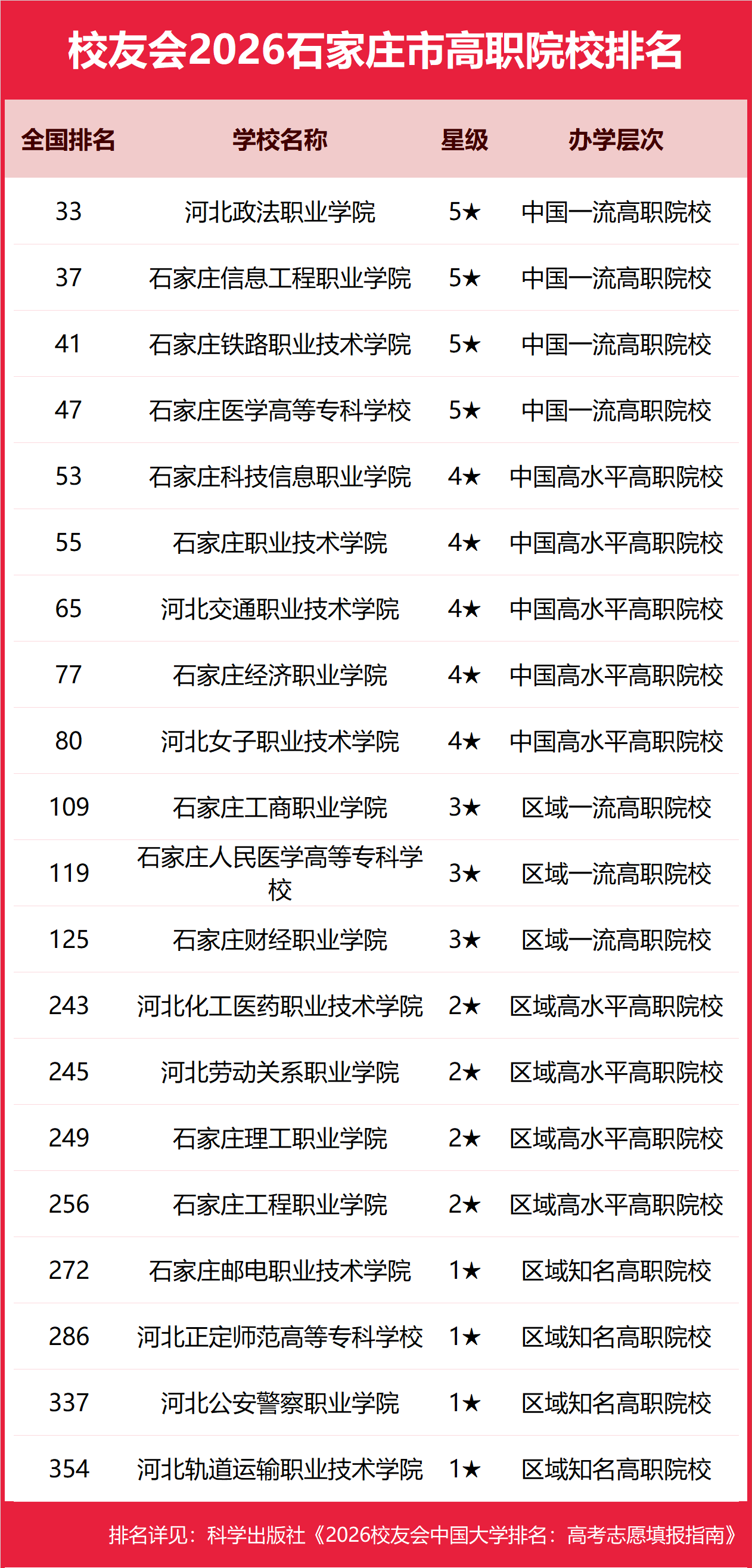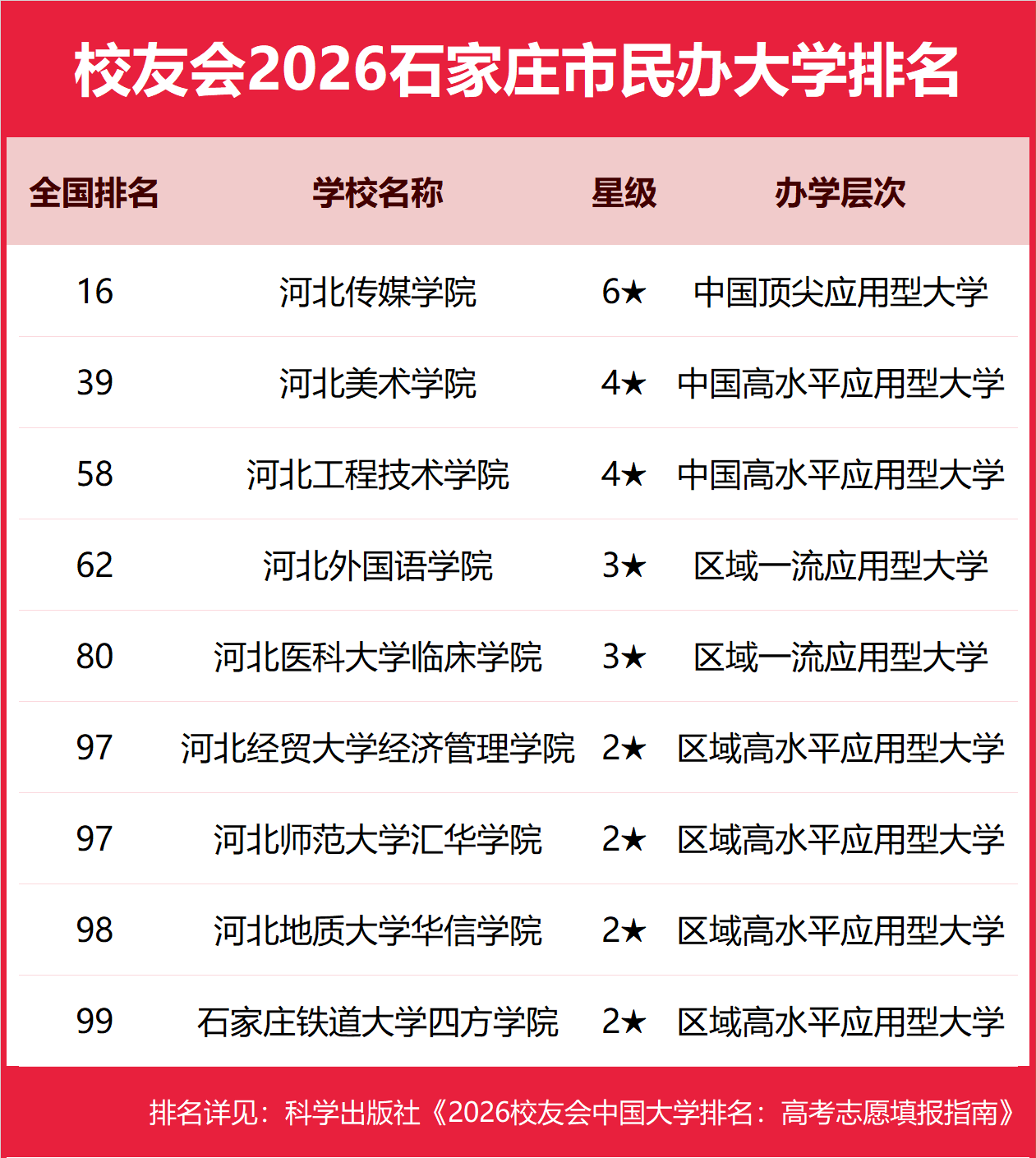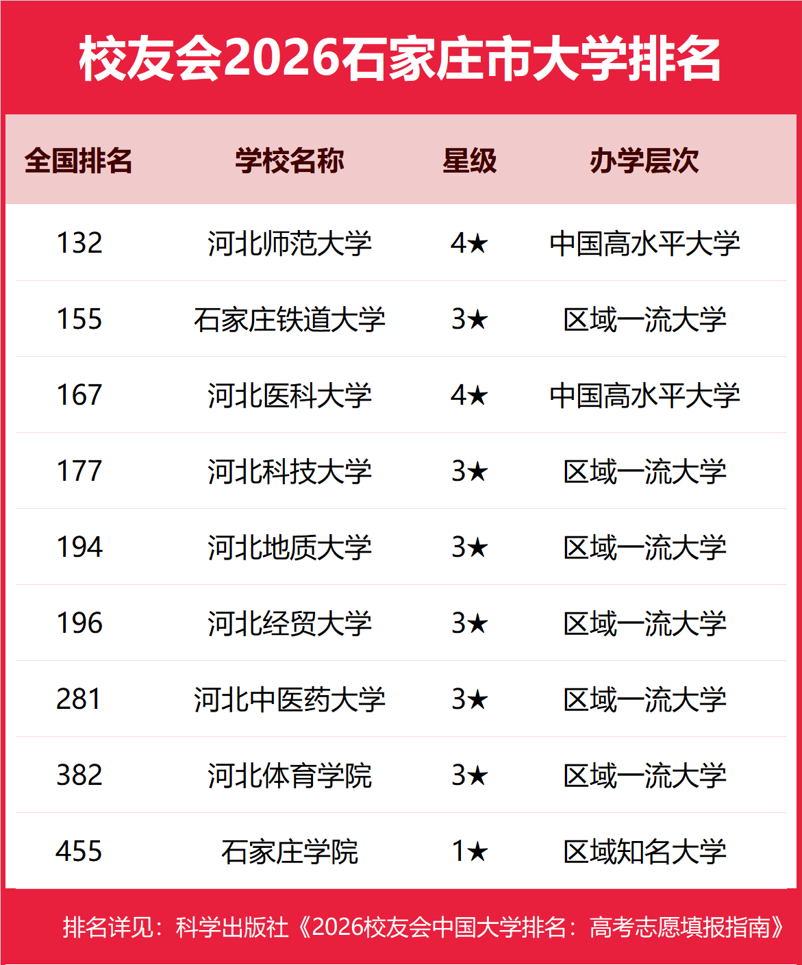 1月12日,全国第三方大学评价机构艾瑞深校友会网(Cuaa.net)正式发布校友会2026中国大学排名、2026石家庄市大学排名、2026石家庄市民办大学排名、2026石家庄市职业技术大学排名和2026石家庄市高职院校排名等榜单。 北京大学问鼎校友会2026中国大学排名榜首,连续20年蝉联中国大学排名冠军。清华大学第二,中国科学院大学、浙江大学并列第三,南开大学挺进前七。其中,河北师范大学、河北传媒学院、河北工业职业技术大学、河北政法职业学院分列2026石家庄市大学、民办大学、职业技术大学和高职院校排名第一 由艾瑞深研究团队撰写的《2026校友会中国大学排名:高考志愿填报指南》一书将由科学出版社出版发行。 科学出版社《2026校友会中国大学排名:高考志愿填报指南》 校友会2026石家庄市大学排名,河北师范大学第一,石家庄铁道大学、河北医科大学前三 在校友会2026中国大学排名中,河北师范大学全国排名第132名,雄居校友会2026石家庄市大学排名第一。石家庄铁道大学第2,河北医科大学第3。名列前10名的其他院校为河北科技大学、河北地质大学、河北经贸大学、河北中医药大学、河北体育学院、石家庄学院。 校友会2026石家庄市民办大学排名,河北传媒学院第一,河北美术学院、河北工程技术学院前三 在校友会2026中国民办大学排名中,河北传媒学院全国排名第16名,雄居校友会2026石家庄市民办大学排名第一。河北美术学院第2,河北工程技术学院第3。名列前10名的其他民办院校为河北外国语学院、河北医科大学临床学院、河北经贸大学经济管理学院、河北师范大学汇华学院、河北地质大学华信学院、石家庄铁道大学四方学院。 校友会2026石家庄市职业技术大学排名,河北工业职业技术大学第一 在校友会2026中国职业技术大学排名中,河北工业职业技术大学全国排名第19名,雄居校友会2026石家庄市职业技术大学排名第一。 校友会2026石家庄市高职院校排名,河北政法职业学院第一,石家庄信息工程职业学院、石家庄铁路职业技术学院前三 在校友会2026中国高职院校排名中,河北政法职业学院全国排名第33名,雄居校友会2026石家庄市高职院校排名第一。石家庄信息工程职业学院第2,石家庄铁路职业技术学院第3。名列前10名的其他高职院校为石家庄医学高等专科学校、石家庄科技信息职业学院、石家庄职业技术学院、河北交通职业技术学院、石家庄经济职业学院、河北女子职业技术学院、石家庄工商职业学院。 校友会中国大学排名首发于2003年,至今已有24年的历史,已成为具有广泛社会影响力、公信力、参考价值与创新力的中国大学排名领先品牌。 艾瑞深校友会2026中国大学排名评价指标体系由办学层次、思政教育、教学质量、高层次人才、杰出校友、学科专业、科研基地、科研项目、科研成果、社会服务、社会声誉和国际影响力等12大一级指标组成。 |