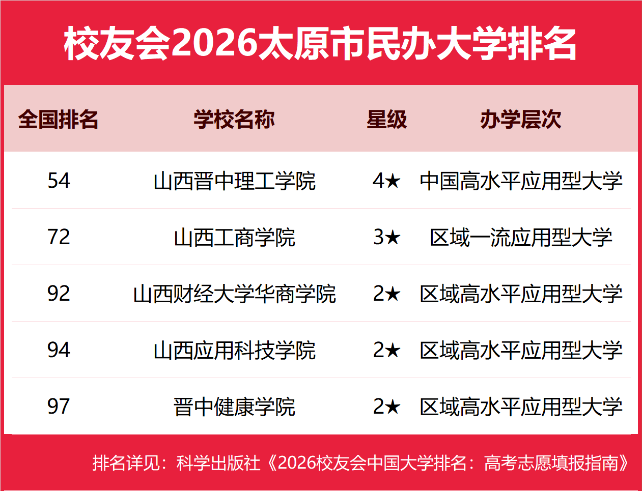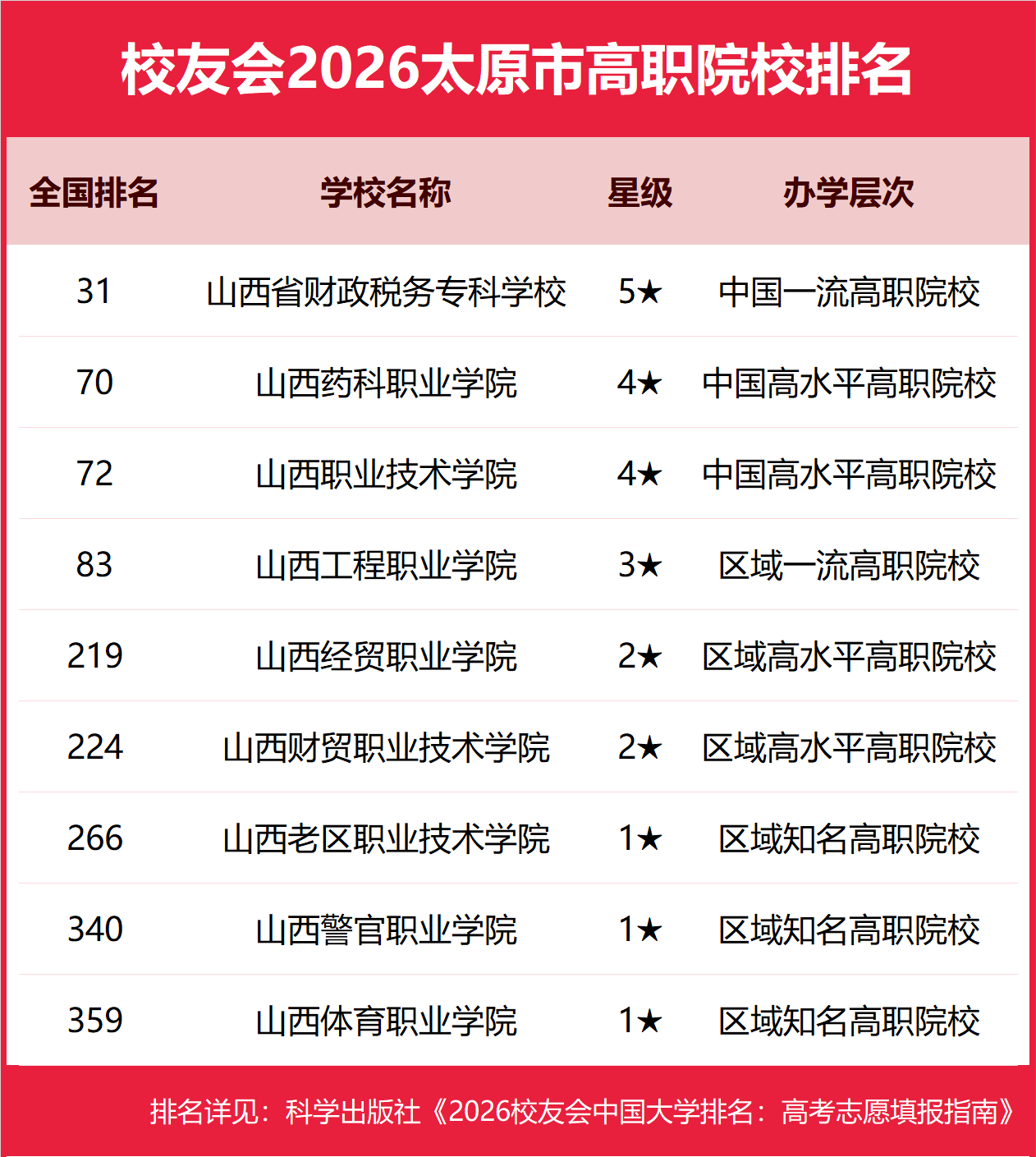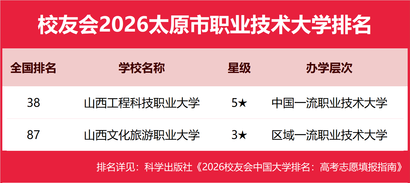 1月12日,全国第三方大学评价机构艾瑞深校友会网(Cuaa.net)正式发布校友会2026中国大学排名、2026太原市大学排名、2026太原市民办大学排名、2026太原市职业技术大学排名和2026太原市高职院校排名等榜单。 北京大学问鼎校友会2026中国大学排名榜首,连续20年蝉联中国大学排名冠军。清华大学第二,中国科学院大学、浙江大学并列第三,南开大学挺进前七。其中,山西大学、山西晋中理工学院、山西工程科技职业大学、山西省财政税务专科学校分列2026太原市大学、民办大学、职业技术大学和高职院校排名第一 由艾瑞深研究团队撰写的《2026校友会中国大学排名:高考志愿填报指南》一书将由科学出版社出版发行。 科学出版社《2026校友会中国大学排名:高考志愿填报指南》 校友会2026太原市大学排名,山西大学第一,山西医科大学、太原理工大学前三 在校友会2026中国大学排名中,山西大学全国排名第74名,雄居校友会2026太原市大学排名第一。山西医科大学第2,太原理工大学第3。名列前10名的其他院校为中北大学、山西财经大学、太原科技大学、太原师范学院、太原工业学院、山西中医药大学、山西传媒学院。 校友会2026太原市民办大学排名,山西晋中理工学院第一,山西工商学院、山西财经大学华商学院前三 在校友会2026中国民办大学排名中,山西晋中理工学院全国排名第54名,雄居校友会2026太原市民办大学排名第一。山西工商学院第2,山西财经大学华商学院第3。名列前10名的其他民办院校为山西应用科技学院、晋中健康学院。 校友会2026太原市职业技术大学排名,山西工程科技职业大学第一,山西文化旅游职业大学前三 在校友会2026中国职业技术大学排名中,山西工程科技职业大学全国排名第38名,雄居校友会2026太原市职业技术大学排名第一。山西文化旅游职业大学第2。 校友会2026太原市高职院校排名,山西省财政税务专科学校第一,山西药科职业学院、山西职业技术学院前三 在校友会2026中国高职院校排名中,山西省财政税务专科学校全国排名第31名,雄居校友会2026太原市高职院校排名第一。山西药科职业学院第2,山西职业技术学院第3。名列前10名的其他高职院校为山西工程职业学院、山西经贸职业学院、山西财贸职业技术学院、山西老区职业技术学院、山西警官职业学院、山西体育职业学院。 校友会中国大学排名首发于2003年,至今已有24年的历史,已成为具有广泛社会影响力、公信力、参考价值与创新力的中国大学排名领先品牌。 艾瑞深校友会2026中国大学排名评价指标体系由办学层次、思政教育、教学质量、高层次人才、杰出校友、学科专业、科研基地、科研项目、科研成果、社会服务、社会声誉和国际影响力等12大一级指标组成。 |