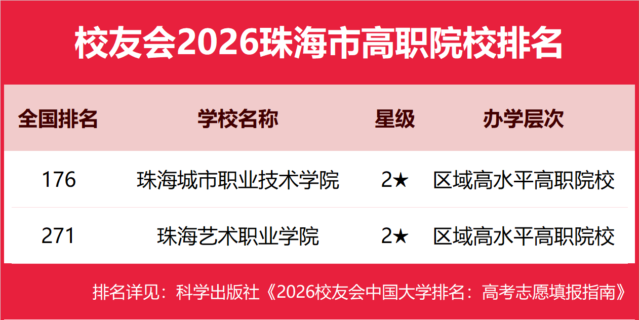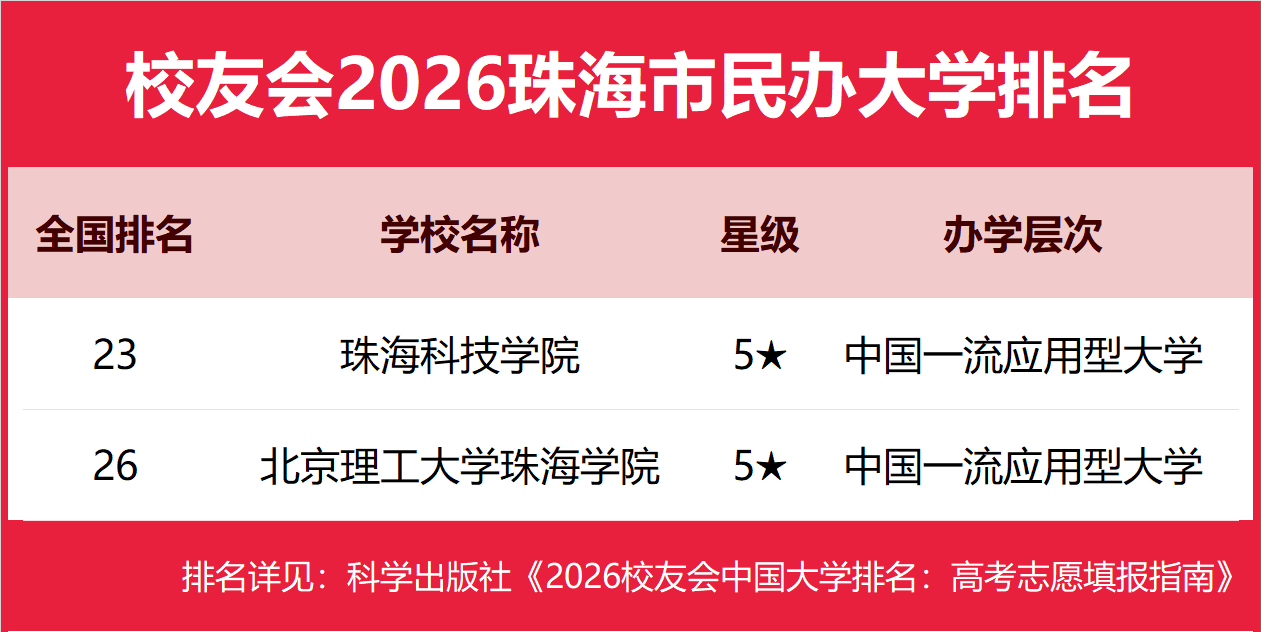 1月12日,全国第三方大学评价机构艾瑞深校友会网(Cuaa.net)正式发布校友会2026中国大学排名、2026珠海市大学排名、2026珠海市民办大学排名和2026珠海市高职院校排名等榜单。 北京大学问鼎校友会2026中国大学排名榜首,连续20年蝉联中国大学排名冠军。清华大学第二,中国科学院大学、浙江大学并列第三,南开大学挺进前七。其中,北师香港浸会大学、珠海科技学院、珠海城市职业技术学院分列2026珠海市大学、民办大学和高职院校排名第一 由艾瑞深研究团队撰写的《2026校友会中国大学排名:高考志愿填报指南》一书将由科学出版社出版发行。 科学出版社《2026校友会中国大学排名:高考志愿填报指南》 校友会2026珠海市大学排名,北师香港浸会大学第一 在校友会2026中国大学排名中,北师香港浸会大学全国排名第69名,雄居校友会2026珠海市大学排名第一。 校友会2026珠海市民办大学排名,珠海科技学院第一,北京理工大学珠海学院前三 在校友会2026中国民办大学排名中,珠海科技学院全国排名第23名,雄居校友会2026珠海市民办大学排名第一。北京理工大学珠海学院第2。 校友会2026珠海市高职院校排名,珠海城市职业技术学院第一,珠海艺术职业学院前三 在校友会2026中国高职院校排名中,珠海城市职业技术学院全国排名第176名,雄居校友会2026珠海市高职院校排名第一。珠海艺术职业学院第2。 校友会中国大学排名首发于2003年,至今已有24年的历史,已成为具有广泛社会影响力、公信力、参考价值与创新力的中国大学排名领先品牌。 艾瑞深校友会2026中国大学排名评价指标体系由办学层次、思政教育、教学质量、高层次人才、杰出校友、学科专业、科研基地、科研项目、科研成果、社会服务、社会声誉和国际影响力等12大一级指标组成。 |