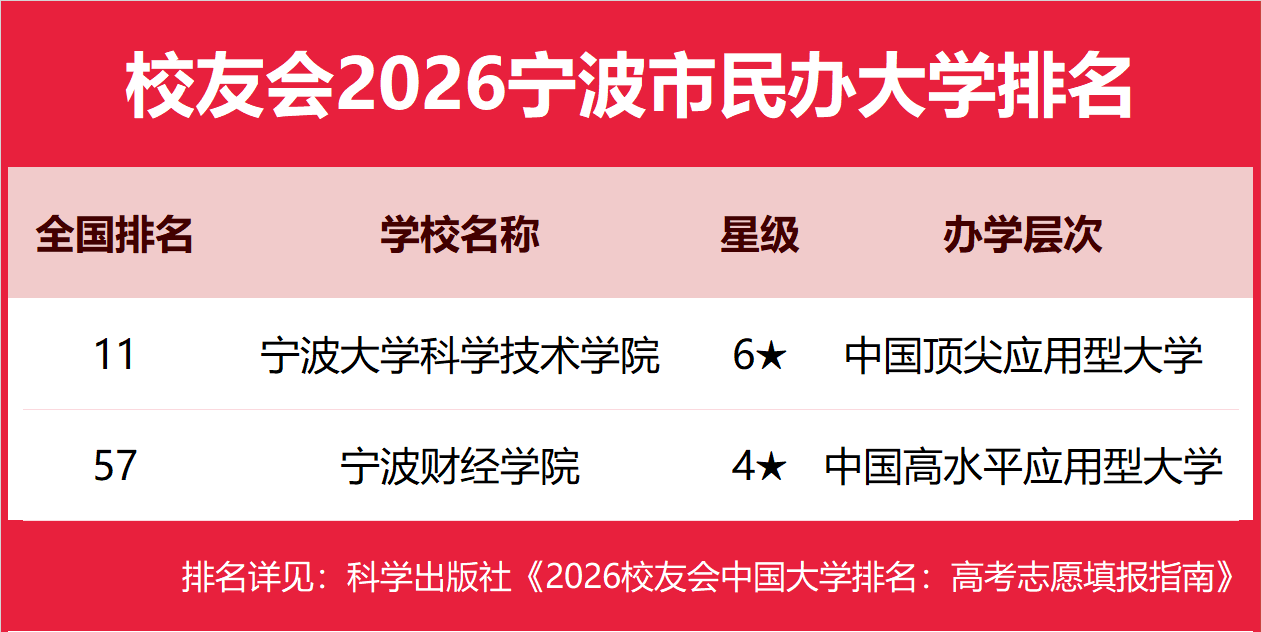 1月12日,全国第三方大学评价机构艾瑞深校友会网(Cuaa.net)正式发布校友会2026中国大学排名、2026宁波市大学排名、2026宁波市民办大学排名、2026宁波市职业技术大学排名和2026宁波市高职院校排名等榜单。 北京大学问鼎校友会2026中国大学排名榜首,连续20年蝉联中国大学排名冠军。清华大学第二,中国科学院大学、浙江大学并列第三,南开大学挺进前七。其中,宁波大学、宁波大学科学技术学院、宁波城市职业技术学院等分列2026宁波市大学、民办大学、职业技术大学和高职院校排名第一 由艾瑞深研究团队撰写的《2026校友会中国大学排名:高考志愿填报指南》一书将由科学出版社出版发行。 科学出版社《2026校友会中国大学排名:高考志愿填报指南》 校友会2026宁波市大学排名,宁波诺丁汉大学第一,宁波大学、宁波东方理工大学前三 在校友会2026中国大学排名中,宁波诺丁汉大学全国排名第47名,雄居校友会2026宁波市大学排名第一。宁波大学第2,宁波东方理工大学第3。名列前10名的其他院校为浙江万里学院、宁波工程学院、浙大宁波理工学院。 校友会2026宁波市民办大学排名,宁波大学科学技术学院第一,宁波财经学院前三 在校友会2026中国民办大学排名中,宁波大学科学技术学院全国排名第11名,雄居校友会2026北京市民办大学排名第一。宁波财经学院第2。 校友会2026宁波市职业技术大学排名,宁波职业技术大学第一,浙江药科职业大学前三 在校友会2026中国职业技术大学排名中,宁波职业技术大学全国排名第6名,雄居校友会2026宁波市职业技术大学排名第一。浙江药科职业大学第2。 校友会2026宁波市高职院校排名,宁波城市职业技术学院第一,浙江纺织服装职业技术学院、浙江工商职业技术学院前三 在校友会2026中国高职院校排名中,宁波城市职业技术学院全国排名第154名,雄居校友会2026宁波市高职院校排名第一。浙江纺织服装职业技术学院第2,浙江工商职业技术学院第3。名列前10名的其他高职院校为宁波卫生职业技术学院。 校友会中国大学排名首发于2003年,至今已有24年的历史,已成为具有广泛社会影响力、公信力、参考价值与创新力的中国大学排名领先品牌。 艾瑞深校友会2026中国大学排名评价指标体系由办学层次、思政教育、教学质量、高层次人才、杰出校友、学科专业、科研基地、科研项目、科研成果、社会服务、社会声誉和国际影响力等12大一级指标组成。 |