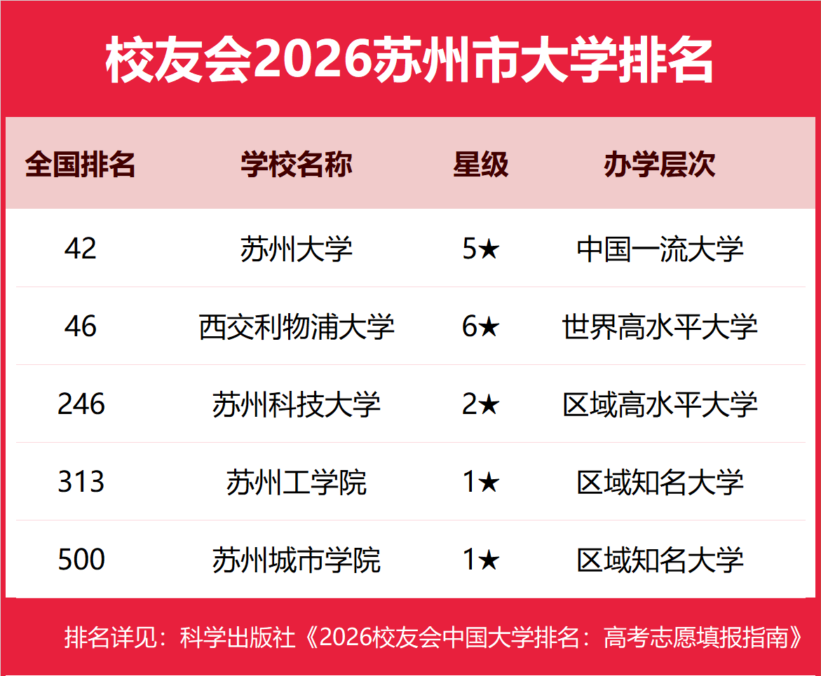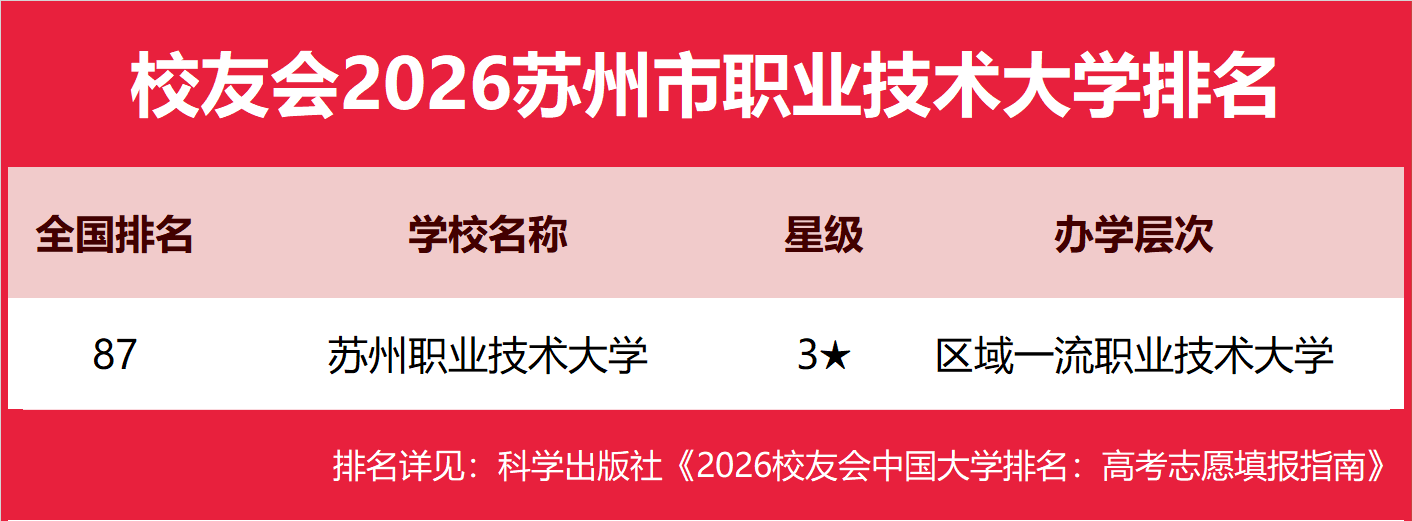 1月12日,全国第三方大学评价机构艾瑞深校友会网(Cuaa.net)正式发布校友会2026中国大学排名、2026苏州市大学排名、2026苏州市民办大学排名、2026苏州市职业技术大学排名和2026苏州市高职院校排名等榜单。 北京大学问鼎校友会2026中国大学排名榜首,连续20年蝉联中国大学排名冠军。清华大学第二,中国科学院大学、浙江大学并列第三,南开大学挺进前七。其中,苏州大学、苏州科技大学天平学院、苏州职业技术大学、苏州经贸职业技术学院分列2026苏州市大学、民办大学、职业技术大学和高职院校排名第一 由艾瑞深研究团队撰写的《2026校友会中国大学排名:高考志愿填报指南》一书将由科学出版社出版发行。 科学出版社《2026校友会中国大学排名:高考志愿填报指南》 校友会2026苏州市大学排名,苏州大学第一,西交利物浦大学、苏州科技大学前三 在校友会2026中国大学排名中,苏州大学全国排名第42名,雄居校友会2026苏州市大学排名第一。西交利物浦大学第2,苏州科技大学第3。名列前10名的其他院校为苏州工学院、苏州城市学院。 校友会2026苏州市民办大学排名,苏州科技大学天平学院第一,苏州大学应用技术学院前三 在校友会2026中国民办大学排名中,苏州科技大学天平学院全国排名第23名,雄居校友会2026苏州市民办大学排名第一。苏州大学应用技术学院第2。 校友会2026苏州市职业技术大学排名,苏州职业技术大学第一 在校友会2026中国职业技术大学排名中,苏州职业技术大学全国排名第87名,雄居校友会2026苏州市职业技术大学排名第一。 校友会2026苏州市高职院校排名,苏州经贸职业技术学院第一,苏州农业职业技术学院、苏州工艺美术职业技术学院前三 在校友会2026中国高职院校排名中,苏州经贸职业技术学院全国排名第23名,雄居校友会2026苏州市高职院校排名第一。苏州农业职业技术学院第2,苏州工艺美术职业技术学院第3。名列前10名的其他高职院校为苏州卫生职业技术学院、苏州工业园区职业技术学院、苏州信息职业技术学院、苏州工业职业技术学院、苏州百年职业学院、昆山登云科技职业学院、苏州高博职业学院。 校友会中国大学排名首发于2003年,至今已有24年的历史,已成为具有广泛社会影响力、公信力、参考价值与创新力的中国大学排名领先品牌。 艾瑞深校友会2026中国大学排名评价指标体系由办学层次、思政教育、教学质量、高层次人才、杰出校友、学科专业、科研基地、科研项目、科研成果、社会服务、社会声誉和国际影响力等12大一级指标组成。 |
