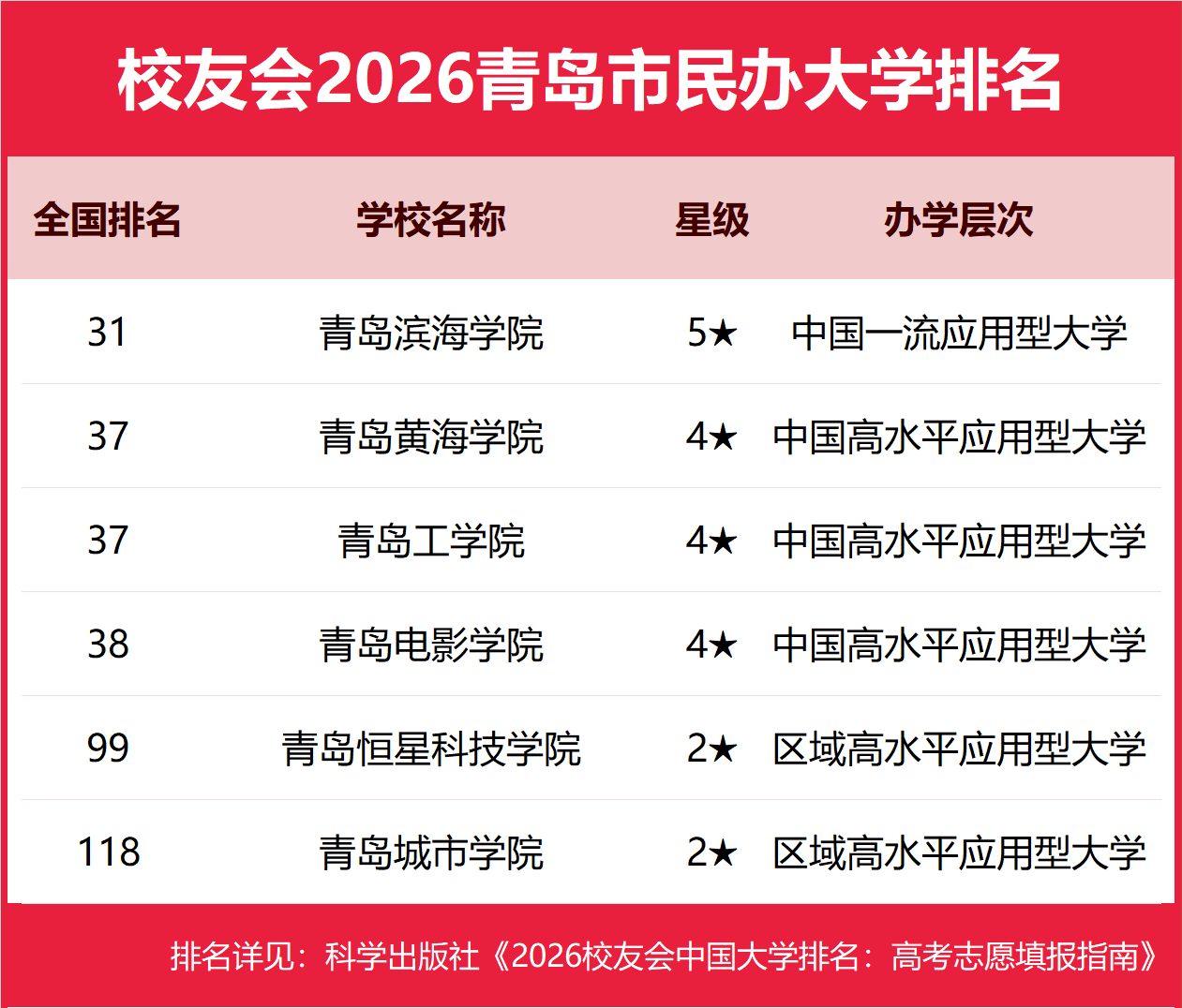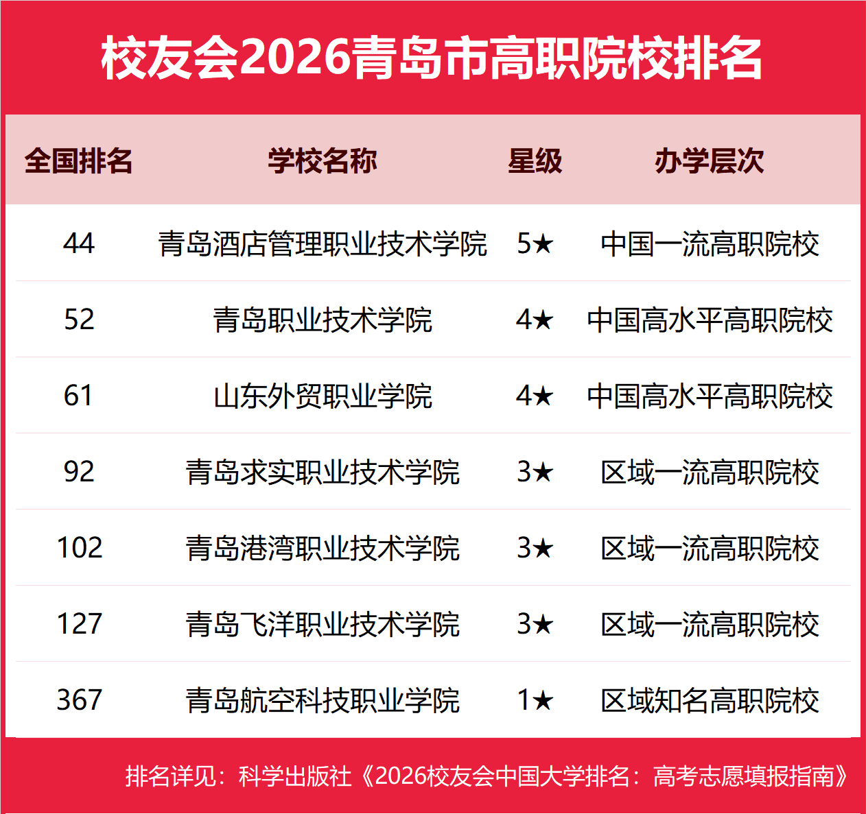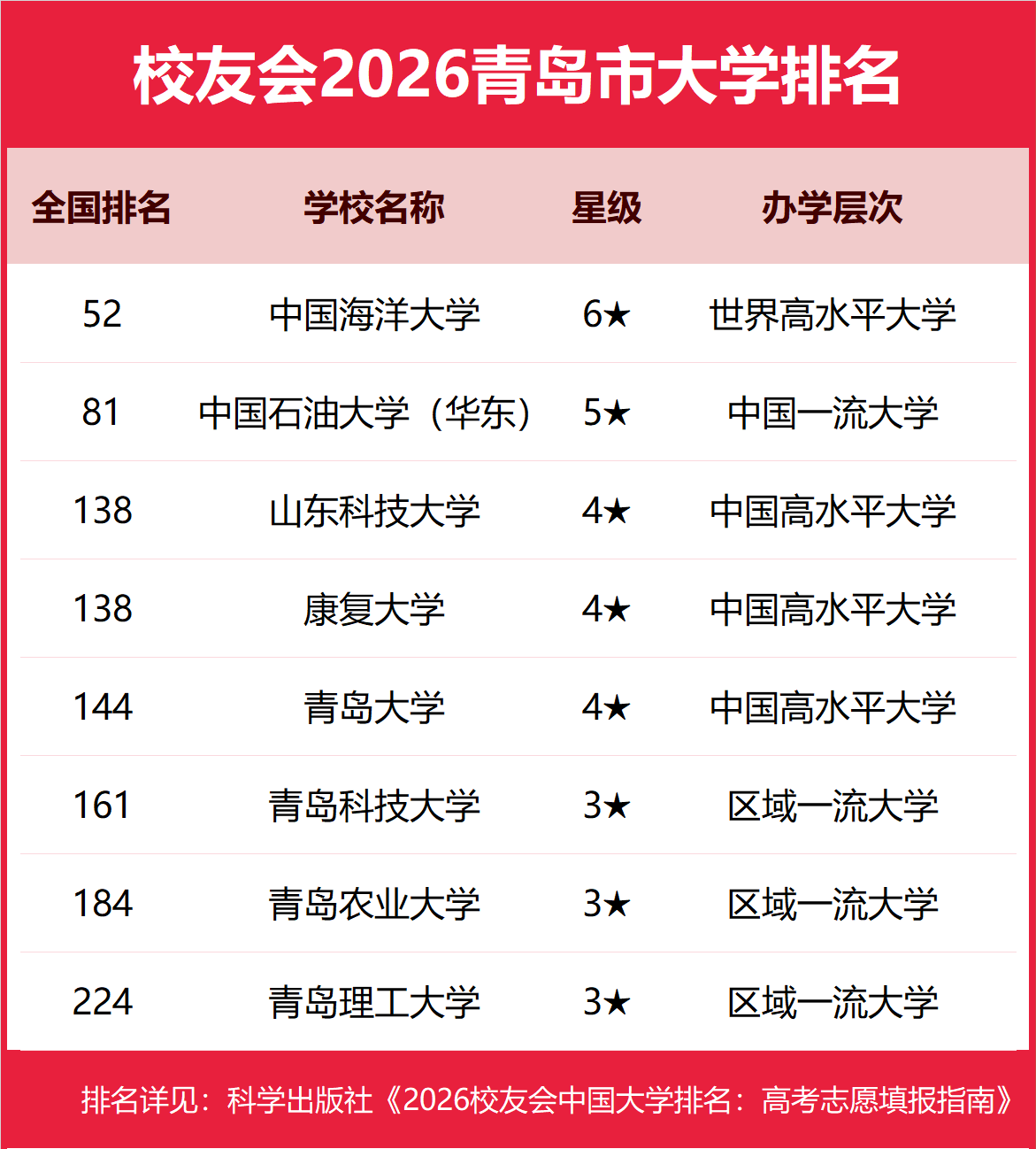 1月12日,全国第三方大学评价机构艾瑞深校友会网(Cuaa.net)正式发布校友会2026中国大学排名、2026青岛市大学排名、2026青岛市民办大学排名、2026青岛市职业技术大学排名和2026青岛市高职院校排名等榜单。 北京大学问鼎校友会2026中国大学排名榜首,连续20年蝉联中国大学排名冠军。清华大学第二,中国科学院大学、浙江大学并列第三,南开大学挺进前七。其中,中国海洋大学、青岛滨海学院、青岛酒店管理职业技术学院分列2026青岛市大学、民办大学和高职院校排名第一 由艾瑞深研究团队撰写的《2026校友会中国大学排名:高考志愿填报指南》一书将由科学出版社出版发行。 科学出版社《2026校友会中国大学排名:高考志愿填报指南》 校友会2026青岛市大学排名,中国海洋大学第一,中国石油大学(华东)、山东科技大学前三 在校友会2026中国大学排名中,中国海洋大学全国排名第52名,雄居校友会2026青岛市大学排名第一。中国石油大学(华东)第2,山东科技大学第3。名列前10名的其他院校为康复大学、青岛大学、青岛科技大学、青岛农业大学、青岛理工大学。 校友会2026青岛市民办大学排名,青岛滨海学院第一,青岛黄海学院、青岛工学院前三 在校友会2026中国民办大学排名中,#大学#全国排名第58名,雄居校友会2026青岛市民办大学排名第一。青岛黄海学院第2,青岛工学院第3。名列前10名的其他民办院校为青岛电影学院、青岛恒星科技学院、青岛城市学院。 校友会2026青岛市高职院校排名,青岛酒店管理职业技术学院第一,青岛职业技术学院、山东外贸职业学院前三 在校友会2026中国高职院校排名中,青岛酒店管理职业技术学院全国排名第44名,雄居校友会2026青岛市高职院校排名第一。青岛职业技术学院第2,山东外贸职业学院第3。名列前10名的其他高职院校为青岛求实职业技术学院、青岛港湾职业技术学院、青岛飞洋职业技术学院、青岛航空科技职业学院。 校友会中国大学排名首发于2003年,至今已有24年的历史,已成为具有广泛社会影响力、公信力、参考价值与创新力的中国大学排名领先品牌。 艾瑞深校友会2026中国大学排名评价指标体系由办学层次、思政教育、教学质量、高层次人才、杰出校友、学科专业、科研基地、科研项目、科研成果、社会服务、社会声誉和国际影响力等12大一级指标组成。 |