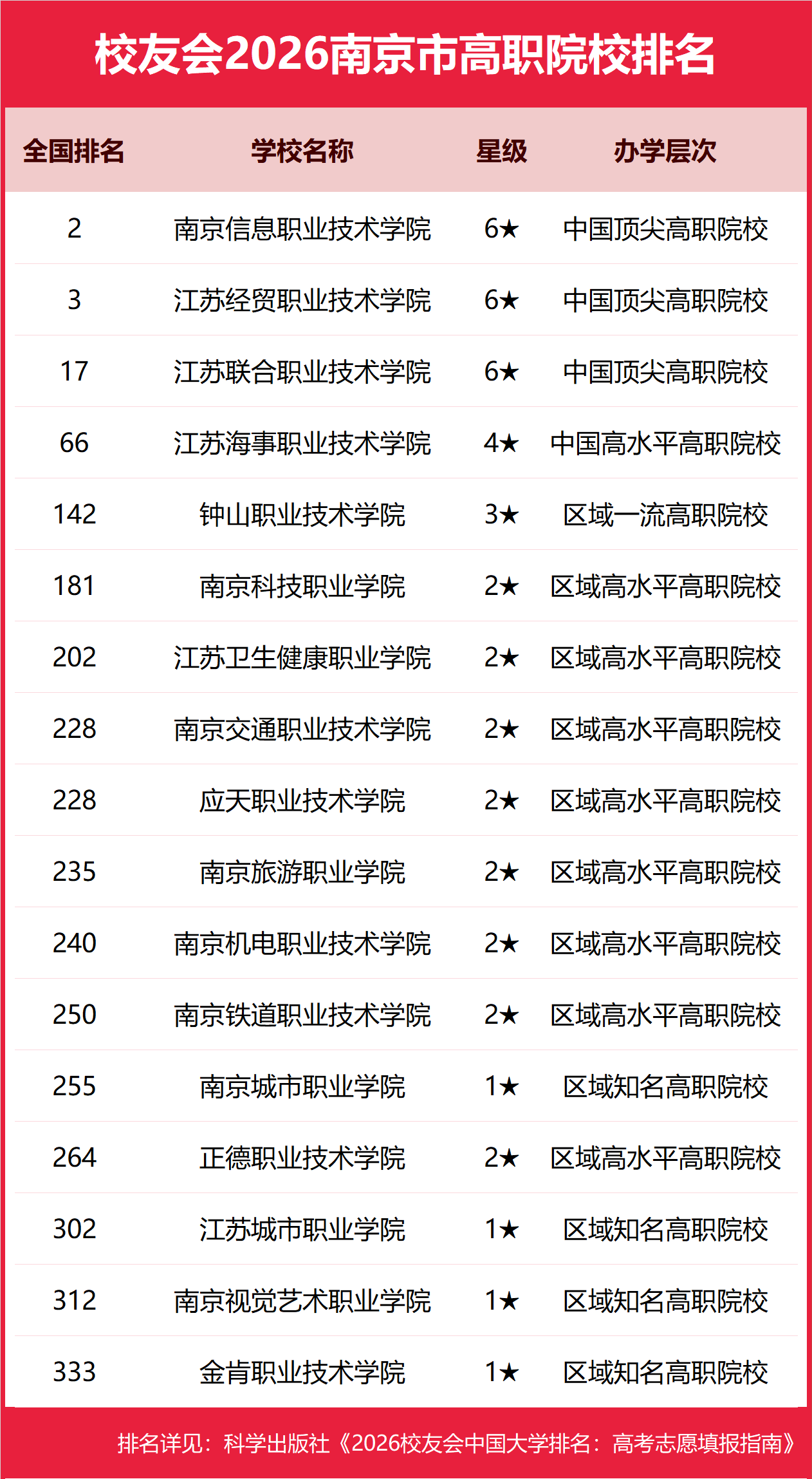 | 校友会2026南京市大学排名,南京大学、南京传媒学院、南京工业职业技术大学、南京信息职业技术学院第一 | |||