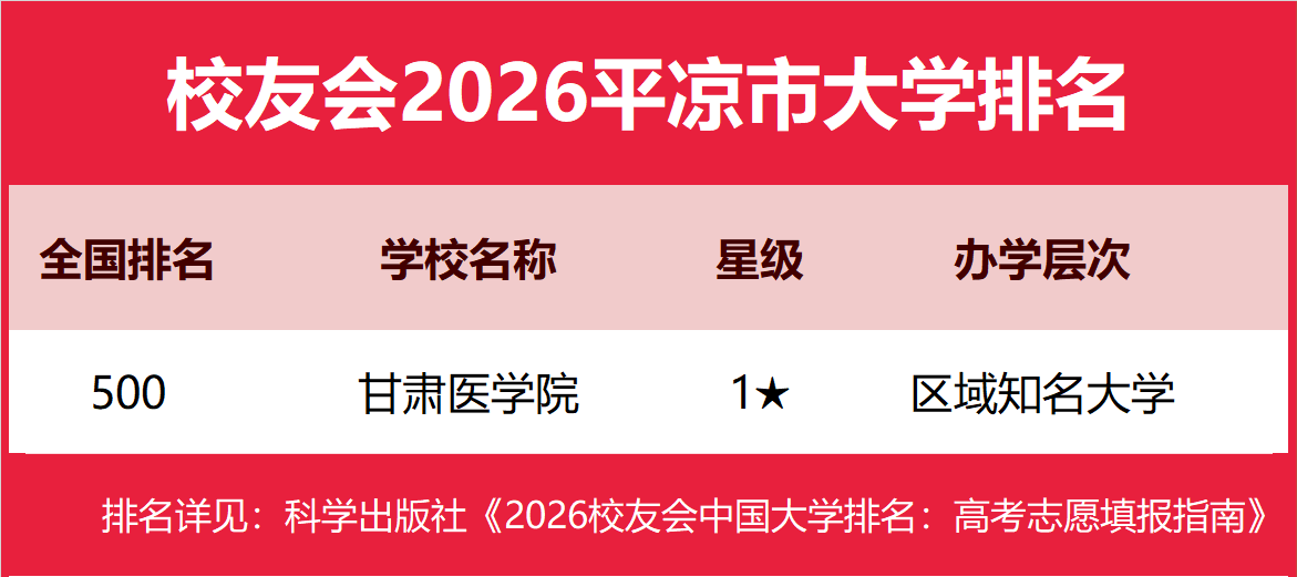 | 校友会2026平凉市大学排名,甘肃医学院、平凉职业技术学院第一 | |||