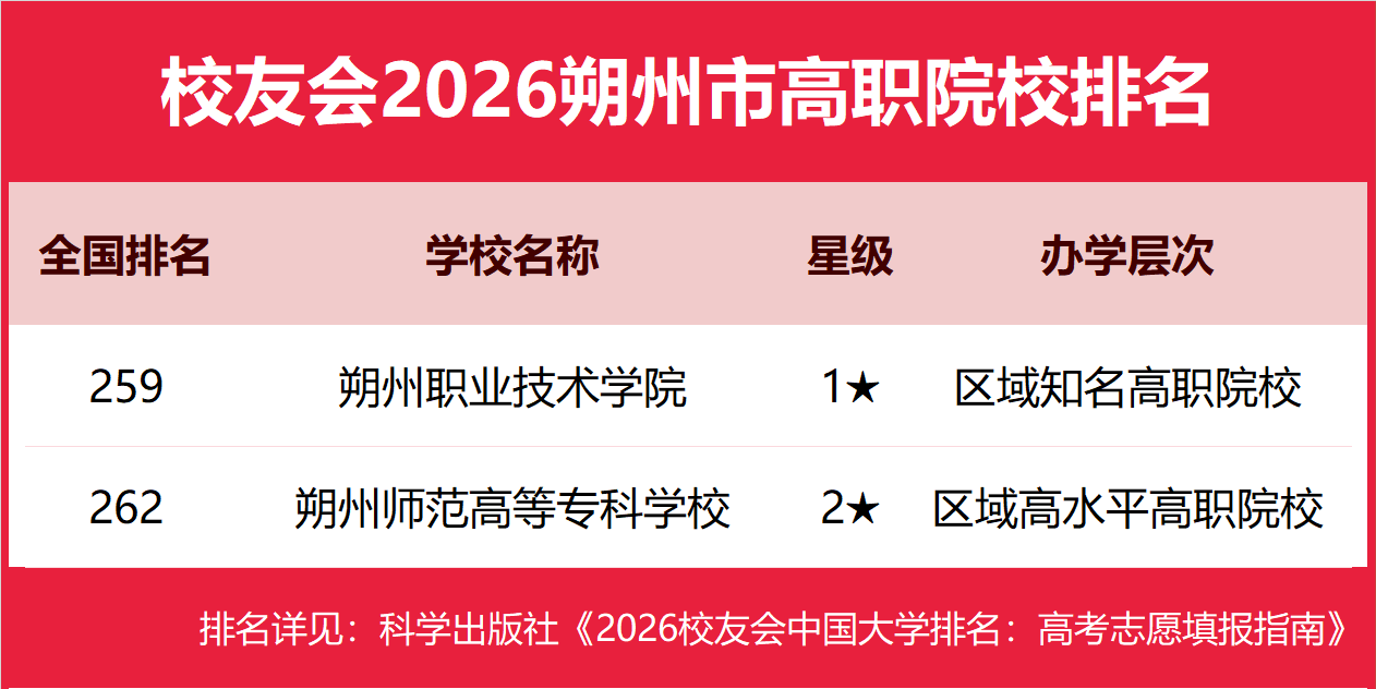 1月12日,全国第三方大学评价机构艾瑞深校友会网(Cuaa.net)正式发布校友会2026中国大学排名、2026朔州市大学排名和2026朔州市高职院校排名等榜单。 北京大学问鼎校友会2026中国大学排名榜首,连续20年蝉联中国大学排名冠军。清华大学第二,中国科学院大学、浙江大学并列第三,南开大学挺进前七。其中,山西工学院、朔州职业技术学院分列2026朔州市大学和高职院校排名第一 由艾瑞深研究团队撰写的《2026校友会中国大学排名:高考志愿填报指南》一书将由科学出版社出版发行。 科学出版社《2026校友会中国大学排名:高考志愿填报指南》 校友会2026朔州市大学排名,山西工学院第一 在校友会2026中国大学排名中,商洛学院全国排名第447名,雄居校友会2026朔州市大学排名第一。 校友会2026朔州市高职院校排名,朔州职业技术学院第一,朔州师范高等专科学校前二 在校友会2026中国高职院校排名中,朔州职业技术学院全国排名第259名,雄居校友会2026朔州市高职院校排名第一。朔州师范高等专科学校第2。 校友会中国大学排名首发于2003年,至今已有24年的历史,已成为具有广泛社会影响力、公信力、参考价值与创新力的中国大学排名领先品牌。 艾瑞深校友会2026中国大学排名评价指标体系由办学层次、思政教育、教学质量、高层次人才、杰出校友、学科专业、科研基地、科研项目、科研成果、社会服务、社会声誉和国际影响力等12大一级指标组成。 |