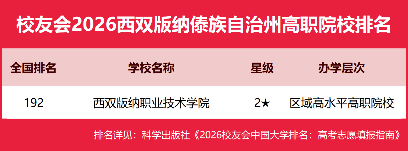 | 校友会2026西双版纳傣族自治州大学排名,西双版纳职业技术学院第一 | |||