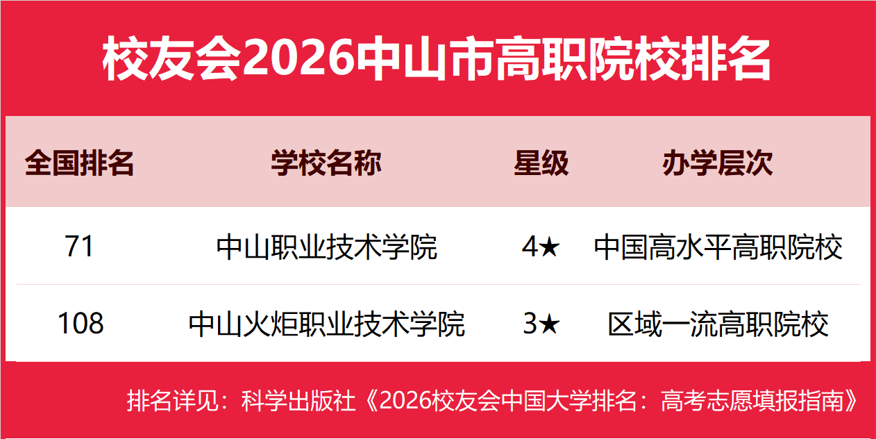 | 校友会2026中山市大学排名,电子科技大学中山学院、中山职业技术学院第一 | |||